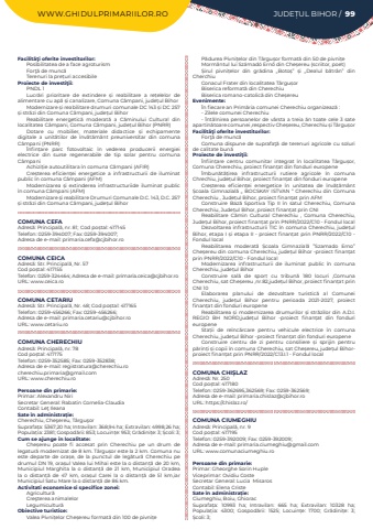 WWW.GHIDULPRIMARIILOR.RO JUDE%u021aUL BIHOR / 99Facilit%u00e3%u0163i oferite investitorilor:Posibilitatea de a face agroturism For%u0163%u0103 de munc%u0103Terenuri la pre%u021buri accesibileProiecte de investi%u0163ii:PNDL 1Lucr%u0103ri prioritare de extindere %u0219i reabilitare a re%u021belelor de alimentare cu ap%u0103 %u0219i canalizare, Comuna C%u00e2mpani, jude%u021bul BihorModernizare %u0219i reabilitare drumuri comunale DC 143 %u0219i DC 257 %u0219i str%u0103zi din Comuna C%u00e2mpani, jude%u021bul BihorReabilitare energetic%u0103 moderat%u0103 a C%u0103minului Cultural din localitatea C%u00e2mpani, Comuna C%u00e2mpani, jude%u021bul Bihor (PNRR)Dotare cu mobilier, materiale didactice %u0219i echipamente digitale a unit%u0103tilor de %u00eenv%u0103t%u0103m%u00e2nt preuniversitar din comuna C%u00e2mpani (PNRR)%u00cenfin%u021bare parc fotovoltaic %u00een vederea producerii energiei electrice din surse regenerabile de tip solar pentru comuna C%u00e2mpaniAchizi%u021bie autoutilitara %u00een comuna C%u00e2mpani (AFIR)Cre%u0219terea eficien%u021bei energetice a infrastructurii de iluminat public %u00een comuna C%u00e2mpani (AFM)Modernizarea %u0219i extinderea infrastructuriide iluminat public %u00een comuna C%u00e2mpani (AFM) Modernizare %u0219i reabilitare Drumuri Comunale D.C. 143, D.C. 257 %u0219i str%u0103zi din Comuna C%u00e2mpani, jude%u021bul BihorCOMUNA CEFAAdres%u0103: Principal%u0103, nr. 81; Cod po%u0219tal: 417145Telefon: 0259-394007; Fax: 0259-394007; Adresa de e-mail: primaria.cefa@cjbihor.roCOMUNA CEICAAdres%u0103: Str. Principal%u0103, Nr. 57Cod po%u0219tal: 417155Telefon: 0259-324464; Adresa de e-mail: primaria.ceica@cjbihor.roURL: www.ceica.roCOMUNA CETARIUAdres%u0103: Str. Principal%u0103, Nr. 48; Cod po%u0219tal: 417165Telefon: 0259-456266; Fax: 0259-456266; Adresa de e-mail: primaria.cetariu@cjbihor.roURL: www.cetariu.roCOMUNA CHERECHIU Adres%u0103: Principal%u0103, nr. 78Cod po%u0219tal: 417175Telefon: 0259-352585; Fax: 0259-352838; Adresa de e-mail: registratura@cherechiu.rocherechiu.primaria@gmail.comURL: www.cherechiu.roPersoane din primarie:Primar: Alexandru NiriSecretar General: Rabatin Cornelia-ClaudiaContabil: Le%u0163 IleanaSate %u00een administra%u021bie:Cherechiu, Che%u015fereu, T%u00e2rgu%u015forSuprafa%u021ba:%u00a05367,20 ha; Intravilan:%u00a0368,94 ha; Extravilan:%u00a04998,26 ha; Popula%u021bia:%u00a02381; Gospod%u0103rii:%u00a0853; Locuin%u021be:%u00a0953; Gr%u0103dini%u021be:%u00a03; %u0218coli:%u00a03; Cum se ajunge in localitate:Che%u0219ereu poate fi accesat prin Cherechiu pe un drum de legatur%u0103 modernizat de 8 km. T%u00e2rgu%u0219or este la 2 km. Comuna nu este departe de ora%u0219e, de la punctul de leg%u0103tur%u0103 Cherechiu pe drumul DN 19, ora%u0219ul Valea lui Mihai este la o distan%u021b%u0103 de 20 km, Municipiul Marghita la o distan%u021b%u0103 de 21 km, Municipiul Oradea la o distan%u021b%u0103 de 47 km, ora%u0219ul Carei la o distan%u021b%u0103 de 51 km,iar Municipiul Satu Mare la o distan%u021b%u0103 de 86 km.Activitati economice si specifice zonei:Agricultur%u0103Cre%u015fterea animalelorLegumicultur%u0103Obiective turistice:Valea Pivni%u021belor Che%u0219ereu format%u0103 din 100 de pivni%u021beP%u0103durea Pivni%u021belor din T%u00e2rgu%u0219or format%u0103 din 50 de pivni%u021beMorm%u00e2ntul lui Sz%u00e1mad%u00f3 Ern%u0151 din Che%u0219ereu (scriitor, poet)%u0218irul pivni%u021belor din gr%u0103dina %u201eBoto%u0219%u201d %u0219i %u201eDealul b%u0103tr%u00e2n%u201d din CherchiuConacul Frater din localitatea T%u00e2rgu%u0219orBiserica reformat%u0103 din CherechiuBiserica romano-catolic%u0103 din Che%u0219ereuEvenimente:%u00cen fiecare an Prim%u0103ria comunei Cherechiu organizeaz%u0103 :- Zilele comunei Cherechiu- %u00cent%u00e2lnirea persoanelor de v%u00e2rsta a treia %u0103n toate cele 3 sate apartin%u0103toare comunei ,respectiv Che%u0219ereu, Cherechiu %u0219i T%u00e2rgu%u0219orFacilit%u00e3%u0163i oferite investitorilor:For%u0163%u0103 de munc%u0103Comuna dispune de suprafa%u0163%u0103 de terenuri agricole cu soluri de calitate bun%u0103Proiecte de investi%u0163ii:%u00cenfiin%u021bare centru comunitar integrat %u00een localitatea T%u00e2rgu%u0219or, Comuna Cherechiu, proiect finan%u021bat din fonduri europene%u00cembun%u0103t%u0103%u021birea infrastructurii rutiere agricole %u00een comuna Chrechiu, jude%u021bul Bihor, proiect finan%u021bat din fonduri europeneCre%u0219terea eficien%u021bei energetice %u00een unitatea de %u00eenv%u0103%u021b%u0103m%u00e2nt %u0218coala Gimnazial%u0103%u00a0%u201e BOCSKAY ISTVAN %u201c Cherechiu din Comuna Cherechiu , Jude%u021bul Bihor,%u00a0proiect finan%u021bat prin AFMConstruire Baz%u0103%u00a0 Sportiva Tip II %u00een satul Cherechiu, Comuna Cherechiu, Jude%u021bul Bihor, proiect finan%u021bat prin CNIReabilitare C%u0103min Cultural Cherechiu , Comuna Cherechiu, Jude%u021bul Bihor, proiect finan%u021bat prin PNRR/2022/C10 - Fondul localDezvoltarea infrastructurii TIC %u00een comuna Cherechiu, jude%u021bul Bihor,%u00a0etapa I %u0219i etapa II - proiect finan%u021bat prin PNRR/2022/C10 - Fondul localReabilitarea moderat%u0103 %u0218coala Gimnazial%u0103 %u201dSzamado Erno%u201d Che%u0219ereu din comuna Cherechiu, jude%u021bul Bihor -proiect finan%u021bat prin PNRR/2022/C10 - Fondul localModernizarea infrastructurii de iluminat public %u00een comuna Cherechiu, jude%u021bul BihorConstruire sal%u0103 de sport cu tribun%u0103 180 locuri ,Comuna Cherechiu, sat Che%u0219ereu ,nr.82,jude%u021bul Bihor, proiect finan%u021bat prin CNI 10Elaborarea planului de dezvoltare turistic%u0103 al Comunei Cherechiu, jude%u021bul Bihor pentru perioada 2021-2027,%u00a0 proiect finan%u021bat din fonduri europeneReabilitarea %u0219i modernizarea drumurilor %u0219i str%u0103zilor din A.D.I. REGIO BH NORD,jude%u021bul Bihor -proiect finan%u021bat din fonduri europeneSta%u021bii de re%u00eenc%u0103rcare pentru vehicule electrice %u00een comuna Cherechiu, jude%u021bul Bihor -proiect finan%u021bat din fonduri eu