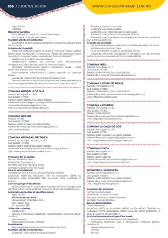 106 / JUDE%u021aUL BIHOR WWW.GHIDULPRIMARIILOR.ROAgricultur%u0103 HoReCaObiective turistice:Situl %u201eBiserica turceac%u0103%u201d %u2013 localitatea Gepiu Lacul Gepiu %u2013 localitatea GepiuFacilit%u00e3%u0163i oferite investitorilor:Bonifica%u021bie de 10% la plata integral%u0103 a impozitelor p%u00e2n%u0103 la data de 31 martieProiecte de investi%u0163ii:Re%u021bea de distribu%u021bie gaze naturale %u00een comuna Gepiu, jude%u021bul Bihor, parte integrant%u0103 a proiectului %u201cRe%u021bea de distribu%u021bie gaze naturale %u00een comune Gepiu, Husas%u0103u de Tinca %u0219i L%u0103z%u0103reni%u201dModernizare str%u0103zi %u00een comuna GepiuModernizare sistem de iluminat prin eficientizarea infrastructurii de iluminat public %u00een comuna Gepiu %u00cenfiin%u021bare infrastructur%u0103 pentru transportul verde %u2013 piste pentru biciclete %u00een comuna Gepiu%u00cembun%u0103t%u0103%u021birea infrastructurii rutiere agricole %u00een comuna GepiuLucr%u0103ri de interven%u021bie pentru construc%u021biile civileDezvoltarea de noi capacit%u0103%u021bi de producere a energiei electrice din surse regenerabile pentru autoconsum %u00een comuna GepiuCOMUNA HIDI%u015eELU DE SUSAdres%u0103: Principal%u0103, nr. 328Cod po%u0219tal: 417275Telefon: 0259-335855; Fax: 0259-335855; Adresa de e-mail: registratura@primariahidiseludesus.ro primariahidiseldesus@yahoo.comURL: www.primaria-hidiseludesus.roCOMUNA HOLODAdres%u0103: nr. 228Cod po%u0219tal: 417280Telefon: 0259-311766; Fax: 0259-311766; Adresa de e-mail: primaria.holod@cjbihor.roURL: www.holod.roCOMUNA HUSAS%u0102U DE TINCAAdres%u0103: Sat Husas%u0103 de Tinca, nr. 53Cod po%u0219tal: 417290Telefon: 0259-312858; Fax: 0259-312858; Adresa de e-mail: primaria.husasaudetinca@cjbihor.roURL: www.primariahusasaudetinca.roPersoane din primarie:Primar: Florentin FaurViceprimar: Dorel LeucaSecretar General: Mariana AntonContabil: Elisabeta-Aurora AgudSate %u00een administra%u021bie:Husas%u0103u De Tinca, Fon%u0103u, O%u015fand, Miersig, SititelecSuprafa%u021ba:%u00a0 11599 ha; Intravilan:%u00a0 726 ha; Extravilan:%u00a0 10873 ha; Popula%u021bia:%u00a0 2392; Gospod%u0103rii:%u00a0 893; Locuin%u021be:%u00a0 1232; Gr%u0103dini%u021be:%u00a0 3; %u0218coli:%u00a03; Cum se ajunge in localitate:Se poate ajunge %u00een localitatea Husas%u0103u de Tinca merg%u00e2nd pe DJ 792A la 5km de localitatea Tinca %u0219i la 19 km de localitatea LesActivitati economice si specifice zonei:Agricultur%u0103Firme reprezentative:SC European Vegetable SRLSC Frutcon SRLSC Agrohus SRLObiective turistice:AgroturismBiserici: 5 ortodoxe, 5 baptiste, 1 penticostala, 1 biserica grecocatolic%u0103Monumente:Monumentul Eroilor, MiersigEvenimente:Festivalul produc%u0103torilor locali Husas%u0103u de TincaFacilit%u00e3%u0163i oferite investitorilor:Existen%u021ba unei cariere de piatr%u0103 proprieExisten%u021ba p%u0103durii comunaleExisten%u021ba unui oficiu po%u0219talExisten%u021ba unor re%u021bele de ap%u0103 %u00een patru sateExisten%u021ba unei p%u0103duri comunale de 1500 ha Existen%u021ba unei suprafe%u021be mari de p%u0103%u0219une comunal%u0103, poten%u021bial bun pentru zootehnieProiecte de investi%u0163ii:Construire dispensar medical %u00een localitatea Husas%u0103u de TincaAsfaltare drum vicinal 1 kmForaj alimentare cu ap%u0103 %u00een localitatea Fon%u0103u Cre%u0219terea eficien%u021bei energetice a infrastructurii de iluminat public %u00een comuna Husas%u0103 de Tinca, jude%u021bul BihorCOMUNA INEUAdres%u0103: Principal%u0103, nr. 7Cod po%u0219tal: 417295Telefon: 0259-347015; Fax: 0259-347015; Adresa de e-mail: primariaineu@yahoo.comCOMUNA LAZURI DE BEIU%u015eAdres%u0103: Principal%u0103, nr. 94Cod po%u0219tal: 417300Telefon: 0259-329132; Fax: 0259-329132; Adresa de e-mail: primaria.lazuridebeius@cjbihor.roURL: http://lazuridebeius.roCOMUNA L%u0102Z%u0102RENIAdres%u0103: Principal%u0103, nr. 23Cod po%u0219tal: 417305Telefon: 0259-357607; Adresa de e-mail: primaria.lazareni@cjbihor.roURL: https://primarialazareni.roCOMUNA LUGA%u015eU DE JOSAdres%u0103: Principal%u0103, nr. 177Cod po%u0219tal: 417315Telefon: 0259-346336; Fax: 0259-346336; Adresa de e-mail: lugasudejos@yahoo.comURL: http://www.primarialugasudejos.ro/COMUNA LUNCAAdres%u0103: Principal%u0103, nr. 1Cod po%u0219tal: 417320Telefon: 0259-332540; Adresa de e-mail: primarialunca@yahoo.comURL: https://www.comunaluncabh.ro/MUNICIPIUL MARGHITAAdres%u0103: Calea Republicii, nr. 1Cod po%u0219tal: 415300Telefon: 0259-362001; Fax: 0359-409982; Adresa de e-mail: primaria@marghita.roURL: http://www.marghita.roPersoane din primarie:Primar: Demian ZsoltViceprimar: Cosmin DurneaSecretar General: Cornelia DemeterContabil: Viorica BereteuSate %u00een administra%u021bie:Chet, GhemeteaSuprafa%u021ba:%u00a0 8373 ha; Intravilan:%u00a0 863,61 ha; Extravilan:%u00a0 7509,89 ha; Popula%u021bia:%u00a0 15770; Gospod%u0103rii:%u00a0 6000; Locuin%u021be:%u00a0 3200; Gr%u0103dini%u021be:%u00a0 4; %u0218coli:%u00a02; Licee:%u00a02; Universita%u021bi:%u00a01; Activitati economice si specifice zonei:Fabricarea %u00eembr%u0103c%u0103mintei %u0219i %u00eenc%u0103l%u021b%u0103minteiFabricarea betonului sau a structurilor metalice pentru construc%u021biiPrelucrarea lemnuluiComer%u0163 Servicii