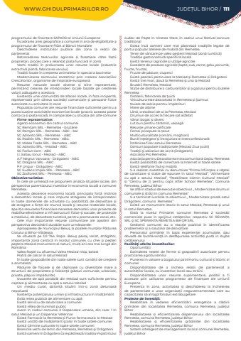 WWW.GHIDULPRIMARIILOR.RO JUDE%u021aUL BIHOR / 111programului de finan%u021bare SAPARD al Uniunii Europene%u00cencadrarea ariei geografice a comunei %u00een aria de eligibilitate a programului de finantare FIDA al B%u0103ncii MondialeDeschiderea institutiilor publice din zona la rela%u021bii de parteneriatRetrocedarea terenurilor agricole %u0219i forestiere c%u0103tre fo%u0219tii proprietari, proces care a relansat pia%u021ba funciar%u0103%u00a0%u00een zon%u0103 Vechi tradi%u021bii %u00een prelucrarea unor resurse locale (industrie extractiv%u0103 piatr%u0103, fabricarea varului)Tradi%u021bii locale %u00een cre%u0219terea animalelor %u00een special a bovinelorModernizarea sectorului zootehnic prin crearea Asocia%u021biilor Cresc%u0103torilor, organisme de inspira%u021bie european%u0103Resurse naturale locale diverse %u0219i bine reprezentate, permi%u021b%u00e2nd crearea de intreprinderi locale bazate pe cre%u0219terea valorii ad%u0103ugate a acestoraExisten%u021ba unei comunit%u0103%u021bi de afaceri locale, %u00een faza incipent%u0103, reprezentat%u0103 prin c%u00e2teva societ%u0103%u021bi comerciale %u0219i persoane fizice autorizate cu activitate %u00een zon%u0103Popula%u021bia comunei are resurse financiare suficiente pentru a putea sus%u021bine activit%u0103%u021bile economice locale (practic aceasta poate conta ca %u0219i pia%u021ba local%u0103, %u00een compara%u021bie cu situa%u021bia din alte comuneFirme reprezentative:Agen%u021bi economici din cadrul comuneiSC Remtam SRL - Remetea - brut%u0103rieSC Remjan SRL - Remetea - ABC - barSC Adranto SRL - Remetea%u00a0%u00a0- ABCSC Roditin SRL - Remetea - ABCSC Midea Trade SRL - Remetea%u00a0- ABCSC Adranto SRL - Meziad%u00a0- ABCSC Forliut Com - ABCI.I. Sabau Ionut - Meziad%u00a0- ABCA.F Negrut Varvoara - Dr%u0103goteni - ABCSC Dragana SRL - ABCP.F Ungur - Dr%u0103goteni%u00a0- ABCSC Eudaco Impex SRL - Petreasa%u00a0- ABCSC Zooforest SRL - Petreasa%u00a0- ABC%u00a0Obiective turistice:%u00cen cele ce urmeaz%u0103%u00a0ne propunem analiza situa%u021biei locale, din perspectiva potentialului investitor %u00een economia local%u0103%u00a0a comunei Remetea. Aceasta deoarece economia local%u0103, principala for%u021b%u0103%u00a0 motrice a dezvolt%u0103rii locale %u015fi care impune atragerea de %u00eentreprinzatori %u00een toate domeniile de activitate cu posibilit%u0103%u0163i de dezvoltare %u015fi de atragere a for%u021bei de munc%u0103 local%u0103 %u015fi resurse materiale locale, apari%u021bia resurselor financiare necesare demar%u0103rii unor proiecte de reabilitare/extindere a infrastructurii fizice %u0219i sociale, de protec%u021bie a mediului, de dezvoltare turistic%u0103, pentru promovarea zonei, etc.Cele mai importante resurse comunitare ale a%u015fez%u0103rii din perspectiva dezvolt%u0103rii durabile sunt urm%u0103toarele:Aproapierea de municipiul Beiu%u015f, la poalele mun%u0163ilor P%u0103durea Craiului %u015fi Bihor-Vl%u0103deasaSe situeaz%u0103 pe DJ 764 Ro%u015fia -Beiu%u015f peisaj variat, atr%u0103g%u0103tor, important%u0103 zon%u0103 carstic%u0103 %u00een nordul comunei, cu chei %u015fi pe%u015fteri pe%u015ftera Meziad monument al naturii, mul%u021bi ani cea mai lung%u0103 din Rom%u00e2niaValea Ro%u015fiei cu afluentul Valea Meziad nisip, balastPiatr%u0103 de calcar %u00een satul Meziad%u00cen toate gospod%u0103riile din toate satele sunt condi%u021bii de cre%u015ftere a animalelorP%u0103durile de foioase %u015fi de r%u0103%u015finoase cu diversitate mare a structurii de proprietate %u015fi folosin%u0163%u0103 (p%u0103duri comunale, urbariale, private, p%u0103%u015funi %u00eemp%u0103durite)Izvoarele de ap%u0103 potabil%u0103 din Meziad sunt suficiente pentru captare %u015fi alimentarea cu ap%u0103 a satului MeziadUn mediu curat, datorit%u0103 situ%u0103rii %u00eentr-o zon%u0103 deluroas%u0103 nepoluat%u0103Existen%u0163a poten%u0163ialului uman %u015fi infrastructura %u00een %u00eenv%u0103%u021b%u0103m%u00e2ntExit%u0103 re%u021bea public%u0103 de alimentare cu ap%u0103Exist%u0103 serviciu de salubrizare a comuneiExist%u0103 re%u021bea de iluminat publicAvem %u00een cadrul comunei 2 Dispensare umane, din care: 1 %u00een satul Meziad %u015fi un Dispensar VeterinarExist%u0103 Farmacie la Remetea %u015fi Punct farmaceutic la MeziadExist%u0103 unit%u0103%u021bi de %u00eenv%u0103%u0163%u0103m%u00e2nt %u015fcolar %u00een toate satele comuneiExist%u0103 C%u0103mine culturale %u00een toate satele comuneiBisericile vechi de lemn din Petreasa, Remetea %u015fi Dr%u0103goteniExist%u0103 oameni %u00een Dr%u0103goteni care p%u0103streaz%u0103 tradi%u021bia %u00eempistritului ou%u0103lor de Pa%u015fte %u00een Vinerea Mare, %u00een cadrul unui festival-concurs tradi%u021bionalExist%u0103 %u00eenc%u0103 oameni care mai p%u0103streaz%u0103 tradi%u0163iile legate de portul popular ateliere de mobil%u0103 din RemeteaTeren de v%u00e2nzare pe valea pe%u015fterii Meziad (zon%u0103 turistic%u0103)Tradi%u021bie gastronomic%u0103 specific%u0103 local%u0103Exist%u0103 terenuri agricole %u015fi utilaje agricoleExcedent de produse agricole (lapte, ou%u0103, carne, gr%u00e2u, porumb, fructe, fructe)Fructe de p%u0103dure, ciuperciExist%u0103 pesc%u0103rii particulare la Meziad %u015fi Remetea %u0219i Dr%u0103goteniExist%u0103 trei mori, dou%u0103 la Remetea %u015fi una la MeziadBrut%u0103rii Remetea, MeziadSta%u021bie de distribuire a carburan%u0163ilor %u015fi a gazului pentru butelie RemeteaDistilerii, fabricarea de %u0163uic%u0103Viticultura este dezvoltat%u0103 %u00een Remetea %u015fi %u015eoimusNuiele de salcie pentru %u00eempletituriMiere de albineL%u00e2n%u0103, cresc%u0103tori de oi la Petreasa, MeziadDrumuri de acces la fiecare sat asfaltatV%u00e2nat bogat %u015fi diversLut bun pentru c%u0103r%u0103mizi, vaioag%u0103Resurse umane calificateFemei pricepute la %u021besutMulticulturalitate (rom%u00e2ni, maghiari)Bun%u0103 %u00een%u0163elegere %u015fi %u00eentrajutorare interconfesional%u0103%u00cent%u00e2lnirea fiilor satului RemeteaDansuri populare t