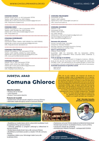 WWW.GHIDULPRIMARIILOR.RO JUDE%u021aUL ARAD / 47COMUNA DEZNAAdres%u0103: Avram Iancu, nr. 63; Cod po%u0219tal: 317110Telefon: 0257-312664; Fax: 0257-312664; Adresa de e-mail: primariacomuneidezna@gmail.comURL: http://comunadezna.ro/COMUNA DIECIAdres%u0103: Principal%u0103, nr. 139 A; Cod po%u0219tal: 317115Telefon: 0257-314408; Fax: 0257-314546; Adresa de e-mail: primariadieci@gmail.comURL: https://dieci.ro/COMUNA DOROBAN%u0162IAdres%u0103: nr. 410Cod po%u0219tal: 315201; Telefon: 0257-535252; Fax: 0257-535252; Adresa de e-mail: primaria.dorobanti@gmail.comURL: https://comuna-dorobanti.ro/COMUNA F%u00c2NT%u00c2NELEAdres%u0103: Principal%u0103, nr. 115; Cod po%u0219tal: 317120Telefon: 0257-456196, 456169; Fax: 0257-456196; Adresa de e-mail: primaria.fantanele@yahoo.comURL: www.primariafantanele-arad.roCOMUNA FELNACAdres%u0103: Trei nr. 330; Cod po%u0219tal: 317125Telefon: 0257-411101; Fax: 0257-411202; Adresa de e-mail: primariafelnac@yahoo.comcontact@primaria-felnac.roURL: http://primaria-felnac.ro/COMUNA FRUMU%u015eENICod po%u0219tal: 317122Telefon: 0257-455250; Adresa de e-mail: contact@frumuseni.roURL: www.frumuseni.roCOMUNA GHIOROCAdres%u0103: nr. 89Cod po%u0219tal: 317135Telefon: 0257-461101; Fax: 0257-461425; Adresa de e-mail: primariaghioroc@gmail.comsecretariat@primariaghioroc.roURL: www.primariaghioroc.roPersoane din primarie:Primar: Corneliu Popi- MorodanViceprimar: Nicolae HedeanSecretar General: Gheorghe Dumitru Cisma%u015fContabil: Florentina Lavinea Timi%u0219Sate %u00een administra%u021bie:Ghioroc, Cuvin, Mini%u015fSuprafa%u021ba:%u00a0 4861 ha; Intravilan:%u00a0 550 ha; Extravilan:%u00a0 4311ha; Popula%u021bia:%u00a0 4051; Gospod%u0103rii:%u00a0 1640; Locuin%u021be:%u00a0 2200; Gr%u0103dini%u021be:%u00a0 4; %u0218coli:%u00a02; Licee:%u00a01; Cum se ajunge in localitate:Comuna Ghioroc este situat%u0103 %u00een Podgoria Aradului, afl%u00e2nduse la 24 km est de municipiul Arad fiind legat%u0103%u00a0 de acesta prin DJ708C si DN 7, de asemenea se mai poate ajunge cu trenul sau cu tramvaiul, comuna noastr%u0103%u00a0fiind cap%u0103tul de linie al tramvaiului.Activitati economice si specifice zonei:Agricultur%u0103Viticultur%u0103