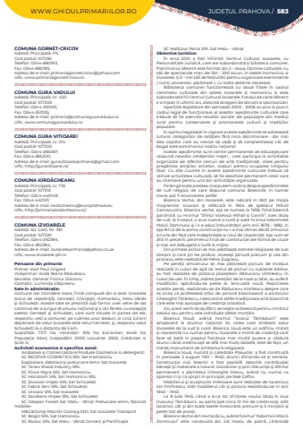 WWW.GHIDULPRIMARIILOR.RO JUDE%u021aUL PRAHOVA / 583COMUNA GORNET-CRICOVAdres%u0103: Principal%u0103, FNCod po%u0219tal: 107290Telefon: 0344-880193; Fax: 0344-880195; Adresa de e-mail: primariagornetcricov@yahoo.comURL: www.primariagornetcricov.roCOMUNA GURA VADULUIAdres%u0103: Principal%u0103, nr. 420Cod po%u0219tal: 107300Telefon: 0244-251005; Fax: 0244-251005; Adresa de e-mail: primaria@comunaguravadului.roURL: www.comunaguravadului.roCOMUNA GURA VITIOAREIAdres%u0103: Principal%u0103, nr. 214Cod po%u0219tal: 107305Telefon: 0244-285067; Fax: 0244-285300; Adresa de e-mail: guravitioareiprimaria@gmail.comURL: http://guravitioarei.ro/COMUNA IORD%u0102CHEANUAdres%u0103: Principal%u0103, nr. 178Cod po%u0219tal: 107310Telefon: 0244-440149; Fax: 0244-440101; Adresa de e-mail: iordacheanu@europrahova.eu URL: http://primariaiordacheanu.ro/COMUNA IZVOARELEAdres%u0103: Str. G%u0103rii, Nr. 381Cod po%u0219tal: 107320Telefon: 0244-292384; Fax: 0244-292384; Adresa de e-mail: izvoareleprimaria@yahoo.co.ukURL: www.izvoarele-ph.roPersoane din primarie:Primar: Ioan Paul GrigoreViceprimar: Anda Ileana R%u0103dulescuSecretar General: Florica DiaconuContabil : Lumini%u0163a Vl%u0103%u015fceanuSate %u00een administra%u021bie:Comuna are %u00eentindere mare, fiind compus%u0103 din 6 sate: Izvoarele (satul de re%u015fedin%u0163%u0103), Cerne%u015fti, Chiri%u0163e%u015fti, Homor%u0203ciu, Malu V%u0203n%u0103t %u015fi Schiule%u015fti. Aceste sate se prezint%u0103 sub forma unei vetre de sat continue de-a lungul drumului na%u0163ional %u015fi a c%u0103ii ferate, cu excep%u0163ia satelor Cerne%u015fti %u015fi Schiule%u015fti, care sunt situate %u00een partea de est, respectiv, vest a comunei, pe culmea unor dealuri, la circa 2,5 km dep%u0103rtare de satul Izvoarele este satul Cernesti, %u015fi, respectiv satul Schiulesti la o distanta de 5 kmSuprafa%u021ba:%u00a0 7371 ha; Intravilan:%u00a0 925 ha; Extravilan:%u00a0 6446 ha; Popula%u021bia:%u00a0 6544; Gospod%u0103rii:%u00a0 2500; Locuin%u021be:%u00a0 2500; Gr%u0103dini%u021be:%u00a0 4; %u0218coli:%u00a05; Activitati economice si specifice zonei:Ambalare %u015fi Comercializare Produse Cosmetice %u0219i detergen%u021biSC BIOSTAR COSMETICS SRL Sat HomorociuExploatare, debitare %u015fi prelucrare lemn Sat IzvoareleSC Tanex Wood Industry SRLSC Pinus Nigra SRL Sat HomoriciuSC Hocolrom SRL Sat Homoriciu SRLSC Zovizvor Impex SRL Sat Schiule%u0219tiSC Fabris Serv SRL Sat Schiule%u0219tiSC Ursoaia SRL Sat IzvoareleSC Sacebero Impex SRL Sat Schiule%u0219tiSC Despan Forest Sat Malu - V%u00e2nat Prelucrare lemn, fabricat mobilierM&C&Comp Macrist Ciomag SNC Sat Izvoarele TransportSC Bogiri SRL Sat HomoriciuSC Razluc SRL Sat Malu - V%u00e2nat Comer%u021b %u015fi Panifica%u0163ie SC Malbizvo Panis SRL Sat Malu %u2013 V%u00e2natObiective turistice:%u00cen anul 2010 a fost %u00eenfiin%u021bat Centrul Cultural Izvoarele, cu Personalitate Juridic%u0103, care are subordonat%u0103%u00a0%u0219i bilioteca comunei. Patrimoniul aferent este format din 2 %u2013 doua C%u0103mine culturale, cu s%u0103li de spectacole mari de 150 %u2013 200 locuri, %u00een satele Homoriciu %u0219i Izvoarele, %u0219i 3 %u2013 trei s%u0103li de festivit%u0103%u021bi pentru organizare evenimente ( nun%u021bi, anivers%u0103ri, p%u0103r%u0103stase ), cu toate dot%u0103rile necesare.%u00a0Biblioteca comunei func%u021bioneaz%u0103%u00a0 cu dou%u0103%u00a0 filiale %u00een cadrul c%u0103minelor culturale din satele Izvoarele %u0219i Homoriciu %u0219i este subordonat%u0103%u00a0PJ Centrul Cultural Izvoarele. Fondul de carte aferent s-a triplat %u00een ultimii ani, datorit%u0103%u00a0atragerii de dona%u021bii %u0219i sponsoriz%u0103ri.Apari%u0163iile legislative din perioada 2003 - 2006 au pus la punct cadrul legal de func%u0163ionare al acestor a%u015fez%u0103minte culturale care trebuie s%u0103 fie aservite nevoilor sociale ale popula%u0163iei din mediul rural pentru conservarea %u015fi promovarea culturii %u015fi tradi%u0163iilor populare.%u00cen spiritul legisla%u0163iei %u00een vigoare aceste a%u015fez%u0103minte se adreseaz%u0103 tuturor categoriilor de cet%u0103%u0163eni f%u0103r%u0103 nicio discriminare - dar mai ales copiilor care au nevoie s%u0103 vad%u0103 %u015fi s%u0103 con%u015ftientizeze c%u00e2t de bogat este patrimoniul nostru na%u0163ional.Aceste a%u015fez%u0103minte sunt centre permanente de educa%u0163ie,care raspund nevoilor cet%u0103%u0163enilor no%u015ftri , care participa la activitatile organizate pe diferite cercuri de art%u0103 tradi%u0163ional%u0103, clase pentru preg%u0103tirea arti%u015ftilor amatori, cluburi pentru ocuparea timpului liber. Cu alte cuvinte %u00een aceste a%u015fez%u0103minte culturale trebuie s%u0103 re%u00eenvie activitatea cultural%u0103, s%u0103 fie deschise permanent celor care au chemare pentru una din activit%u0103%u0163ile organizate.Pe l%u00e2ng%u0103 toate acestea, mai putem vorbi %u015fi despre a%u015fez%u0103mintele de cult religios, de care dispune comuna. Bisericile, %u00een num%u0103r mare, pot fi enumerate, astfel:Biserica Veche, din Izvoarele, este ridicat%u0103 %u00een 1801 pe mo%u015fia mo%u015fnenilor Izvorani %u015fi ref%u0103cut%u0103 %u00een 1854 de sp%u0103tarul Mihail Cantacuzino. Biserica veche, a%u015fa se numea la 1938, fiind biseric%u0103 parohial%u0103 cu Hramul %u201cSfin%u021bii%u00a0Voievozi Mihail %u015fi Gavriil%u201d; aces l%u0103ca%u015f de cult, la %u00eenceput, a avut numai o turl%u0103 %u015fi avea hramul Adormirea Maicii Domnului %u015fi i s-a adus %u00eembun%u0103t%u0103%u0163iri prin anii 1878 %u2013 1882, %u00een a%u015fa fel c%u0103 de la prima construc%u0163ie nu i-a mai r%u0103mas dec%u0203t amvonul %u015fi turla din fa%u0163%u0103 care %u00eendepline%u015fte %u015fi rolul de clopotni%u0163%u0103; a%u015fa cum se afl%u0103 %u00een prezent, perimetrul final de construc%u0163ie are form%u0103 de cruce %u015fi mai are ad%u0103ugat%u0103 o turl%u0103 la mijloc.Din primele picturi se mai p%u0103streaz%u0103 scenele religioase de sub st