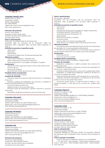 598 / JUDE%u021aUL SATU MARE WWW.GHIDULPRIMARIILOR.ROCOMUNA ORA%u015eU NOUAdres%u0103: Seini, nr. 247ACod po%u0219tal: 447220Telefon: 0261-830001; Fax: 0261-830001; Adresa de e-mail: corasunou@yahoo.comURL: www.orasunou.roPersoane din primarie:Primar: Gavril MailatViceprimar: Dohi Laszlo AttilaSecretar General: Sonia Teodora StanContabil: B%u00fcte TimeaSate %u00een administra%u021bie:Ora%u015fu Nou Vii, Prilog, Prilog Vii, Remetea-Oa%u015fSuprafa%u021ba:%u00a0 5981 ha; Intravilan:%u00a0 83 ha; Extravilan:%u00a0 4890 ha; Popula%u021bia:%u00a0 3754; Gospod%u0103rii:%u00a0 1600; Locuin%u021be:%u00a0 2500; Gr%u0103dini%u021be:%u00a0 4; %u0218coli:%u00a04; Activitati economice si specifice zonei:Agricultur%u0103Viticultur%u0103Pomicultur%u0103Fabric%u0103 de%u00a0%u00eenc%u0103l%u0163%u0103minte: SC Ricosta Rom%u00e2nia SRLObiective turistice:Monumentul Sz%u00e9cseny - Remetea-Oa%u015fHotel- restaurant SC Dorle SRL Ora%u015fu NouZona de agrement %u201cLac Mujdeni%u201d %u015fi popasul %u201cMujdeni%u201dEvenimente:T%u00e2rg de animale, organizat a doua zi de luni din fiecare lun%u0103Concurs de vinConcurs de %u201cP%u0103linc%u0103%u201dZiua comunei, ultima duminic%u0103 din iulieFacilit%u00e3%u0163i oferite investitorilor:Zona de agrement MujdeniProiecte de investi%u0163ii:%u00cenfiin%u021bare sta%u021bie de %u00eenc%u0103rcare vehicule electrice %u00een localitatea Ora%u0219u NouDotarea unit%u0103%u021bilor de %u00eenv%u0103%u021b%u0103m%u00e2nt din comun%u0103%u00a0cu mobilier %u0219i diverse materiale didactice %u0219i informaticeConstruire sediu prim%u0103rie nouAsfaltare str%u0103zi %u00een comuna Ora%u0219u Nou%u00cenfiin%u021bare re%u021bea de distribu%u021bie a gazelor naturale %u00een comuna Ora%u0219u NouExtinderea re%u021belei de canalizare %u00een comuna Ora%u0219u NouCOMUNA P%u0102ULE%u015eTIAdres%u0103: Principal%u0103, nr. 83Cod po%u0219tal: 447230Telefon: 0261-757306; Fax: 0261-757306 tasta 1; Adresa de e-mail: comunapaulesti@paulestism.roURL: http://www.paulestism.ro/COMUNA PETRE%u015eTIAdres%u0103: Pi%u015fcoltului, nr. 1Cod po%u0219tal: 447240Telefon: 0261-820063; Fax: 0261-820063; Adresa de e-mail: primariapetresti@gmail.comURL: https://www.petresti-sm.ro/COMUNA PIRAdres%u0103: Principal%u0103, nr. 51Cod po%u0219tal: 447245Telefon: 0261-821702, 821718; Fax: 0261-821718, 821702; Adresa de e-mail: primariapir@yahoo.comURL: www.primariapir.roPersoane din primarie:Primar: Kis Lorand EndreViceprimar:%u00a0C%u0103lin Nicolae PonteaSecretar General: Mihail Marius ArdeleanContabil: Dorina Ioana Sf%u00e2raSate %u00een administra%u021bie:Pir, Piru Nou, S%u0103rv%u0103zelSuprafa%u021ba:%u00a0 4111 ha; Intravilan:%u00a0 364 ha; Extravilan:%u00a0 3747 ha; Popula%u021bia:%u00a0 1595; Gospod%u0103rii:%u00a0 713; Locuin%u021be:%u00a0 688; Gr%u0103dini%u021be:%u00a0 1; %u0218coli:%u00a02; Activitati economice si specifice zonei:Agricultur%u0103Viticultur%u0103 Croitorie (30 de persoane angajate SC Vegasa Impex SRL)Societatea agricol%u0103 %u201cVia%u0163a Nou%u0103%u201d PirSocietatea agricol%u0103 %u201cRena%u015fterea%u201d PirOportunit%u0103%u021bi:30 km de la grani%u021ba cu UngariaFor%u021b%u0103 de munc%u0103Acces la DN1 F %u0219i la drumul european E81Teren gratuit cu condi%u021bia cre%u0103rii a 30 de locuri de munc%u0103Obiective turistice:Unul dintre monumentele de arhitectur%u0103 cele mai importante ale localit%u0103%u021bii Pir %u00eel constituie Biserica Reformat%u0103.Pe raza comunei se g%u0103se%u0219te un lac amenajat pentru pescuit, ofer%u0103 turi%u0219tilor relaxare %u00eentr-un mediu curat %u0219i aer proasp%u0103tEvenimente:Ziua Comunei PirConcursul de vinuri nobileFacilit%u00e3%u0163i oferite investitorilor:Teren gratuit pentru investitori , l%u00e2ng%u0103 DJ 195CProiecte de investi%u0163ii:Reabilitare energetic%u0103 a cl%u0103dirii prim%u0103riei din comuna Pir, jude%u021bul Satu MareReabilitare energetic%u0103 a c%u0103minului cultural din localitatea Pir, comuna Pir , jude%u021bul Satu MareAchizi%u021bie echipamente pentru comuna Pir, jude%u021bul Satu MareReabilitare %u0219i modernizare dispensar medical %u0219i farmacie %u00een comuna Pir, jude%u021bul Satu MareSta%u021bii de re%u00eenc%u0103rcare pentru vehicule electrice %u00een comuna PirCre%u0219terea eficien%u021bei energetice a infrastructurii de iluminat public %u00een comuna Pir, jude%u021bul Satu MareConstruire %u0219coal%u0103 nou%u0103 cu 12 s%u0103li de clas%u0103 %u00een regim p + 2e , strada principal%u0103 , nr 279, 281, sat Pir, comuna Pir , jude%u021bul Satu MareCOMUNA PI%u015eCOL%u0162Adres%u0103: Principal%u0103, nr. 329Cod po%u0219tal: 447250Telefon: 0261-824800, 824802; Fax: 0261-824802, 824800; Adresa de e-mail: iscolt@cjsm.roprimariacomuneipiscolt@yahoo.comURL: www.primariapiscolt.roCOMUNA POMIAdres%u0103: Principal%u0103, nr. 110Cod po%u0219tal: 447255Telefon: 0261-871701, 871702; Fax: 0261- 871900; Adresa de e-mail: primaria.pomi@yahoo.comcontact@primariapomi.roURL: https://primariapomi.ro/Persoane din primarie:Primar: Cosmin- Ionel%u00a0Kri%u0219anViceprimar: Mihai Gavril %u0218tefSecretar General: Narcisa ArdelanContabil: Dumitru Petru BlidarSate %u00een administra%u021bie:Pomi, Aciua, Bic%u0103u, Borle%u015ftiSuprafa%u021ba:%u00a0 5805,65 ha; Intravilan:%u00a0 501,60 ha; Extravilan:%u00a0 5304,05 ha; Popula%u021bia:%u00a01937; Gospod%u0103rii:%u00a01040; Locuin%u021be:%u00a01040; Gr%u0103dini%u021be:%u00a02; %u0218coli:%u00a01; Cum se ajunge in localitate:Pentru a ajunge %u00een localitatea noastr%u0103 sunt 4 posibilit%u0103%u021bi:1. DJ 193 Satu Mare-P%u0103ule%u0219ti- Ambud-Petin-Apateu-CorodCulciu Mic-Culciu Mare-C%u0103r%u0103%u0219eu-Lip%u0103ui-Valea Vinului-Ro%u0219ioriPomi (37 km)