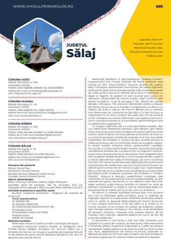 WWW.GHIDULPRIMARIILOR.RO 605Suprafa%u021b%u0103: 3.864 km%u00b2Popula%u021bie: 258.717 locuitoriRe%u0219edin%u021b%u0103 de jude%u021b: Zal%u0103uPopula%u021bia re%u0219edin%u021bei de jude%u021b: 71.580 locuitoriJUDE%u021aULS%u0103lajCOMUNA AGRIJAdres%u0103: Principal%u0103, nr. 348Cod po%u0219tal: 457005Telefon: 0260-658568, 658658; Fax: 0260-658658; Adresa de e-mail: primaria.agrij@mynextgen.roURL: https://comuna-agrij.ro/COMUNA ALMA%u015eUAdres%u0103: Principal%u0103, nr. 144Cod po%u0219tal: 457010Telefon: 0260-626609; Fax: 0260-626733; Adresa de e-mail: primariaalmasu.salaj@yahoo.comURL: www.comunaalmasu.roCOMUNA B%u0102BENIAdres%u0103: Principal%u0103, nr. 268Cod po%u0219tal: 457020Telefon: 0260-634455, 634399; Fax: 0260-634399; Adresa de e-mail: comunababeni@yahoo.comURL: http://comunababenisalaj.ro/COMUNA B%u0102LANAdres%u0103: Principal%u0103, nr. 76Cod po%u0219tal: 457025Telefon: 0260-664403; Fax: 0260-664404; Adresa de e-mail: primariabalan@yahoo.comURL: www.primariabalan.roPersoane din primarie:Primar: Daniel PopViceprimar: Nicolae Dam%u015faSecretar General: Sebastian Vasile%u00a0AvramContabil: Viorica Mihaela%u00a0Dam%u015faSate %u00een administra%u021bie:B%u0103lan, Chechi%u015f, Chendrea, G%u0103lp%u00eeia, G%u00eelg%u0103u Alma%u015fuluiSuprafa%u021ba:%u00a0 9470 ha; Intravilan:%u00a0 326 ha; Extravilan:%u00a0 9144 ha; Popula%u021bia:%u00a03770; Gospod%u0103rii:%u00a01903; Locuin%u021be:%u00a01903; Gr%u0103dini%u021be:%u00a05; %u0218coli:%u00a05; Activitati economice si specifice zonei:Brut%u0103rie, magazine alimentare , magazine de material de construc%u0163iiFirme reprezentative:SC SORIAD SRLSC DAMOS TRANS SRLSC CONSTRUC%u0163II EXCAVATII DVF SRLProduc%u0103tori locali:PFA MNEREA IOANA VICTORIAProduse locale: MIERE DE ALBINEObiective turistice:Rezerva%u0163ia natural %u0103 Gr%u0103dina zmeilor, sat G%u00eelg%u0103u Alma%u015fului:Complexul structural Gr%u0103dina Zmeilor se desf%u0103%u015foar%u0103 %u00eentre limitele satului G%u00e2lg%u0103ul Alma%u015fului din comuna B%u0103lan, pe o %u00eentindere de 32,5 ha, ce include %u015fi suprafa%u0163a de protec%u0163ie de 6,25 ha de p%u0103dure de gorun situat%u0103 deasupra abruptului din care se desprind blocurile de st%u00e2nc%u0103.Rezerva%u0163ie geologic%u0103 %u015fi geomorfologic%u0103, %u201cGr%u0103dina Zmeilor%u201d, impresionant%u0103 prin marea varietate de forme reziduale, este inclus%u0103 pe lista monumentelor naturale ocrotite din jude%u0163ul S%u0103laj. Forma%u0163iuni sedimentare monoclinale, de v%u00e2rsta oligocen%u0103, alc%u0103tuite din gresii %u015fi microconglomerate, slab cimentate (stratele de Hida), printre care sunt inserate benzi dure %u00een alternan%u0163%u0103 cu argile %u015fi magm%u0103, se apleac%u0103 lin spre sud-est spre cursul v%u0103ii Alma%u015fului. Responsabil de crearea acestui relief ruiniform este p%u00e2r%u00e2ul Incheieturi, lung de aproape 2 km, afluent din partea st%u00e2ng%u0103 a Alma%u015fului. Prin eroziune diferen%u0163ial%u0103, acesta a dislocat din frontul structural ce se %u00eentinde %u00een lungime pe cca. 600 m cu %u00een%u0103l%u0163imi de 15-25 m blocuri de m%u0103rimi diferite care %u00een prezent sunt diseminate pe o distan%u0163%u0103 de 250-300 m %u00een fa%u0163a frontului %u015fi implantate %u00eentr-un strat compact de argile ro%u015fii. Cei doi versan%u0163i ai V%u0103ii Incheieturi au evoluat diferen%u0163iat, sub aspectul ritmului %u00een care s-a produs erodarea lor %u015fi al proceselor geomorfologice care au determinat sculptarea lor.La %u00eenceput, ad%u00e2ncirea v%u0103ii a urmat declivitatea stratelor, fapt ce a determinat deplasarea talvegului spre dreapta, spre dealul Dosul. Eroziunea accentuat%u0103 a stratelor din baz%u0103 a subminat acest versant, determin%u00e2nd o serie de pr%u0103bu%u015firi %u015fi alunec%u0103ri de teren ce au antrenat pe pant%u0103 cantit%u0103%u0163i de materiale mult mai mari dec%u00e2t capacitatea de transport a cursului de ap%u0103, aceasta duc%u00e2nd la %u00eenal%u0163area fundului v%u0103ii %u015fi la %u00eencetinirea vitezei de scurgere a apelor. %u00cen aceste condi%u0163ii, versantul st%u00e2ng, corespunz%u0103tor suprafe%u0163ei structurale, a %u00eenceput s%u0103 fie erodat aureolar, apele din precipita%u0163ii manifest%u00e2nd tendin%u0163e de a se aduna %u00eentr-un organism toren%u0163ial. Dup%u0103 ce prin procesul de pluvio-denuda%u0163ie a fost %u00eendep%u0103rtat solul care acoperea stratele de gresie %u015fi micro-conglomerate, a ap%u0103rut o %u00eentins%u0103 re%u0163ea de fisuri dispuse rectangular, pe care s-a orientat ravina%u0163ia. Prin %u015firoire au fost evacuate rapid nisipurile %u015fi pietri%u015furile ce proveneau din aceste fisuri, a%u015fa c%u0103 %u00een scurt%u0103 vreme fisurile s-au ad%u00e2ncit p%u00e2n%u0103 la straturile de marne %u015fi argile ro%u015fii, impermeabile. Blocuri mari de roci s-au desprins din suprafa%u0163a structural%u0103 ini%u0163ial%u0103 permi%u0163%u00e2nd astfel %u00eenceperea proceselor de modelare a %u201cGr%u0103dinii Zmeiilor%u201d. Nisipuri %u015fi pietri%u015furi predominant cuar%u0163oase, slab cimentate, ce formeaz%u0103 gresiile %u015fi micro-conglomeratele, au fost dislocate de agen%u0163ii sub-aerieni %u015fi s-au depus la baza blocurilor peste orizontul argilo-marnos form%u00e2nd %u00een prezent un strat de pietri%u015furi amestecate cu argil%u0103 %u00een care se cantoneaz%u0103 apele din precipita%u0163ii d%u00e2nd na%u015ftere, din loc %u00een loc, unor iviri arteziene.Pe alocuri, %u00een aceast%u0103 suprafa%u0163%u0103 %u00eenclinat%u0103 apar mici ponoare prin care se %u00eenfiltreaz%u0103 apele prim%u0103vara, puse %u00een eviden%u0163%u0103 de vegeta%u0163ia higrofil%u0103 ce le populeaz%u0103. Sistemele de diaclaze, despre care s-a vorbit, au favorizat desprinderea din frontul structural a unor coloane prismatice, la fel de %u00eenalte ca %u015fi acesta %u015fi cu muchii ascu%u0163ite, ce au %u00eenceput s%u0103 culiseze pe 