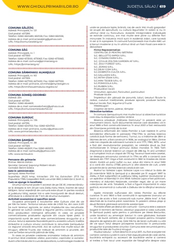 WWW.GHIDULPRIMARIILOR.RO JUDE%u021aUL S%u0102LAJ / 619COMUNA S%u0102L%u0102%u0162IGAdres%u0103: Principal%u0103, nr. 121Cod po%u0219tal: 457295Telefon: 0260-650480, 650126; Fax: 0260-650126; Adresa de e-mail: primariasalatig@yahoo.comURL: http://comunasalatig.ro/COMUNA S%u00c2GAdres%u0103: Principal%u0103, nr. 1Cod po%u0219tal: 457300Telefon: 0260-673100, 673063; Fax: 0260-673063; Adresa de e-mail: comuna@primariasig.roURL: https://primariasig.ro/COMUNA S%u00c2NMIHAIU ALMA%u015eULUIAdres%u0103: Principal%u0103, nr. 93Cod po%u0219tal: 457305Telefon: 0260-627100, 627400; Fax: 0260-627100; Adresa de e-mail: primarie_sinmihai@mynextgen.roURL: https://sinmihaiualmasului.regista.ro/COMUNA SOME%u015e-ODORHEIAdres%u0103: 234Cod po%u0219tal: 457310Telefon: 0260-654603; Adresa de e-mail: somesodorheicj@yahoo.co.ukURL: https://comunasomesodorhei.ro/COMUNA SURDUCAdres%u0103: Principal%u0103, nr. 135Cod po%u0219tal: 457315Telefon: 0260-634702; Fax: 0260-634702; Adresa de e-mail: primaria_surduc@yahoo.comURL: www.primariasurduc.roCOMUNA %u015eAM%u015eUDAdres%u0103: Principal%u0103, nr. 38Cod po%u0219tal: 457325Telefon: 0260-653201; Fax: 0260-653213; Adresa de e-mail: samsudsj@yahoo.comURL: www.samsud.roPersoane din primarie:Primar: B%u00e1nt%u00f3%u00a0Zolt%u00e1nSecretar General: %u015eopronyi R%u00f3bert-Istv%u00e1nContabil: Balint EsteraSate %u00een administra%u021bie:%u015eam%u015fud, Valea PomilorSuprafa%u021ba:%u00a0 29,23 kmp; Intravilan:%u00a0 210 ha; Extravilan:%u00a0 2713 ha; Popula%u021bia:%u00a01785; Gospod%u0103rii:%u00a0949; Locuin%u021be:%u00a0863; Gr%u0103dini%u021be:%u00a02; %u0218coli:%u00a02; Cum se ajunge in localitate:Drumul comunal poate fi accesat de pe DE 81, intersect%u00e2nduse la dreapta la km 20 pe ruta Zal%u0103u-Satu Mare, %u00eenainte de satul S%u0103l%u0103jeni. Satul re%u0219edin%u021b%u0103 de comun%u0103 este situat %u00een partea nordic%u0103 al jude%u021bului S%u0103laj, a%u0219ezat %u00eentr-o vale %u00eenconjurat%u0103 de dou%u0103 dealuri, afl%u00e2nduse la o distan%u021b%u0103 de 7 km de drumul european.Activitati economice si specifice zonei:Ocupa%u021bia principal%u0103 a locuitorilor este Cultura vi%u021bei de vie pe 106 ha teren. Teritoriul satului este de 2.923 ha, din care 2.231 ha sunt terenuri agricole, iar restul %u00eemp%u0103durite sau necultivate. %u00cen general se cultiv%u0103 cereale %u0219i legume pentru consum propriu. Micii produc%u0103tori %u00eent%u00eempin%u0103 dificult%u0103%u021bi %u00een ceea ce prive%u0219te comercializarea produselor agricole din cauza lipsei pie%u021bii. O important%u0103 surs%u0103 de venit este comercializarea strugurilor %u0219i a vinului. Solul %u0219i a%u0219ezarea favorabil%u0103 pentru aceast%u0103 cultur%u0103, tradi%u021bia str%u0103veche %u0219i cultura vinului contribuie la renumele %u0218am%u0219udului ca regiune vinicol%u0103 renumit%u0103. Aici se cultiv%u0103 mai multe soiuri de struguri, diferite fructe, dar trebuie s%u0103 amintim %u0219i prunele, din care se fierbe renumit%u0103 p%u0103linc%u0103 de S%u0103laj. %u00cen ceea ce prive%u0219te cre%u0219terea animalelor trebuie s%u0103 amintim %u00een primul r%u00e2nd cre%u0219terea vitelor, porcinelor, caprinelor %u0219i ovinelor. Avem o ferm%u0103 de vite %u00een curs de dezvoltare, cu tehnologie modern%u0103 unde se produce lapte, br%u00e2nz%u0103, ca%u0219 de vac%u0103. Mai mul%u021bi gospodari se ocup%u0103 de apicultur%u0103, cu cultura legumelor %u00een solarii %u0219i nu %u00een ultimul r%u00e2nd cu floricultura. Aceast%u0103 %u00eentreprindere individual%u0103 se extinde continuu, are mai multe sere%u00a0 pline cu diferite flori minunate. %u00cen industria mic%u0103 sunt %u00een eviden%u021b%u0103 zidari, care lucrez%u0103 %u00een sat %u0219i %u00een apropiere. %u00cen comun%u0103 func%u021bioneaz%u0103 mai multe ABC-uri %u0219i baruri moderne %u0219i nu %u00een ultimul r%u00e2nd un Fast-Food care este %u00een dezvoltareFirme Reprezentative:CENTRU DE ZI PENTRU B%u0102TR%u00c2NIS.C. BELLOTTO IMPEX S.R.L.S.C. CYNARA FARM S.R.L.S.C. GYULAI ZOLTAN GARDEN AF S.R.L.S.C. ZOLY FOREST S.R.L.S.C. ZORAS S.R.L.S.C.DEAY COM S.R.L.S.C.DOBROTA CULI%u021aA S.R.L.S.C.GALLADIS S.R.L.S.C.INTIM IZSAK S.R.L.S.C.MINI TEOEB S.R.L.-DS.C.POMICOLA S.R.L. S.C.RUBEN S.R.L.Produc%u0103tori locali:Vinicultori, apiculori, floricultori, pomicultoriProduse locale:%u00cempletituri din p%u0103nu%u0219%u0103 de porumb, %u021boluri, %u021besuturi f%u0103cute la razboi, cusuturi tradi%u021bionale, produse apicole, produse lactate, b%u0103uturi locale, flori, legume %u0219i fructeMe%u0219te%u0219ugari: Cioplitor de lemn, pietrar, t%u00e2mplarObiective turistice:%u00cen comuna %u0218am%u0219ud sunt mai multe locuri %u0219i obiective turistice care stau la dispozi%u021bia turi%u0219tilor str%u0103ineBiserica ortodox%u0103 ,,%u00cen%u0103l%u021barea Domnului%u201d %u00een prezent este un monument istoric. Sunt documente istorice care dovedesc c%u0103 %u00een anul 1885 a fost construit%u0103 biserica. %u00cen anul 2001 a fost restaurat%u0103 din finan%u021barea primit%u0103 de la statBiserica reformat%u0103 din Valea Pomilor a luat na%u0219tere %u00een urma extinderilor efectuate %u00een perioada 1792-1794 la vechea biserica catolic%u0103 (sub forma de semicerc). Turnul, cu o %u00een%u0103l%u021bime de 28m %u0219i l%u0103%u021bimea de 4m, a fost construit %u00een 1836, iar orologiul %u021bn 1864. Dintre cele trei clopote de odinioar%u0103-turnate %u00een anii 1771, 1780, 1875- unul a fost dat revolu%u021bionarilor pa%u0219opti%u0219ti, iar celelalte dou%u0103 au fost rechizi%u021bionate %u00een timpul primului r%u0103zboi mondial. %u00cen 1925 Toth Zsigmond a donat bisericii un clopot de 286 kg. %u00cen anii urm%u0103tori s-a cump%u0103rat %u00eenc%u0103 un clopot de 170 kg. Tavanul navei este casetat, iar deasupra amvonului construit %u00een 1794 se afl%u0103 o coroan%u0103 care dateaz%u0103 din 1797. Orga a fost constuit%u0103 %u00een 1861 la Oradea de J%u00f3n%u00e1s Istv%u00e1n. Exi