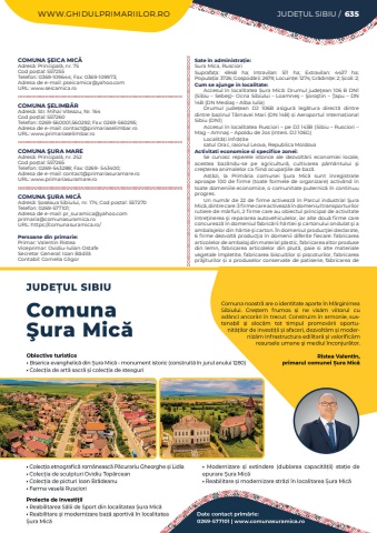 WWW.GHIDULPRIMARIILOR.RO JUDE%u021aUL SIBIU / 635COMUNA %u015eEICA MIC%u0102Adres%u0103: Principal%u0103, nr. 75Cod po%u0219tal: 557255Telefon: 0369-109644; Fax: 0369-109973; Adresa de e-mail: pseicamica@yahoo.comURL: www.seicamica.roCOMUNA %u015eELIMB%u0102RAdres%u0103: Str. Mihai Viteazu, Nr. 164Cod po%u0219tal: 557260Telefon: 0269-560001,560292; Fax: 0269-560295; Adresa de e-mail: contact@primariaselimbar.roURL: www.primariaselimbar.roCOMUNA %u015eURA MAREAdres%u0103: Principal%u0103, nr. 252Cod po%u0219tal: 557265Telefon: 0269-543288; Fax: 0269- 543400; Adresa de e-mail: contact@primariasuramare.roURL: www.primariasuramare.roCOMUNA %u015eURA MIC%u0102Adres%u0103: %u0218oseaua Sibiului, nr. 174; Cod po%u0219tal: 557270Telefon: 0269-577101; Adresa de e-mail: pr_suramica@yahoo.comprimaria@comunasuramica.roURL: https://comunasuramica.ro/Persoane din primarie:Primar: Valentin RisteaViceprimar: Ovidiu-Iulian OstafeSecretar General: Ioan B%u0103dil%u0103Contabil: Cornelia GligorSate %u00een administra%u021bie:Sura Mica, RuscioriSuprafa%u021ba:%u00a0 4948 ha; Intravilan:%u00a0 511 ha; Extravilan:%u00a0 4437 ha; Popula%u021bia:%u00a03726; Gospod%u0103rii:%u00a02679; Locuin%u021be:%u00a01274; Gr%u0103dini%u021be:%u00a02; %u0218coli:%u00a02; Cum se ajunge in localitate:Accesul %u00een localitatea %u0218ura Mic%u0103: Drumul jude%u0163ean 106 B DN1 (Sibiu %u2013 Sebe%u015f)%u2013 Ocna Sibiului %u2013 Loamne%u015f %u2013 %u015eoro%u015ftin %u2013 %u0162apu %u2013 DN 14B (DN Media%u015f %u2013 Alba Iulia)Drumul jude%u021bean DJ 106B asigur%u0103 leg%u0103tura direct%u0103 dintre dintre bazinul T%u00e2rnavei Mari (DN 14B) %u0219i Aeroportul Interna%u021bional Sibiu (DN1) Accesul %u00een localitatea Rusciori %u2013 pe DJ 143B (Sibiu %u2013 Rusciori %u2013 Mag %u2013 Amna%u015f %u2013 Apoldu de Jos (inters. DJ 106G)Localit%u0103%u021bi %u00eenfr%u0103%u021bitesatul Orac, raionul Leova, Republica MoldovaActivitati economice si specifice zonei:Se cunosc reperele istorice ale dezvolt%u0103rii economiei locale, acestea baz%u00e2ndu-se pe agricultur%u0103, cultivarea p%u0103m%u00e2ntului %u015fi cre%u015fterea animalelor ca fiind ocupa%u0163iile de baz%u0103.Ast%u0103zi, la Prim%u0103ria comunei %u015eura Mic%u0103 sunt %u00eenregistrate aproape 100 de firme (toate formele de organizare) activ%u00e2nd %u00een toate domeniile economice, o comunitate puternic%u0103 %u00een continuu progres.Un num%u0103r de 22 de firme activeaz%u0103 %u00een Parcul industrial %u015eura Mic%u0103, dintre care: 3 firme care activeaz%u0103 %u00een domeniul transporturilor rutiere de m%u0103rfuri, 2 firme care au obiectul principal de activitate %u00eentre%u0163inerea %u015fi repararea autovehiculelor, iar alte dou%u0103 firme care concureaz%u0103 %u00een domeniul fabric%u0103rii h%u00e2rtiei %u015fi cartonului ondulat %u015fi a ambalajelor din h%u00e2rtie %u015fi carton. %u00cen domeniul produc%u0163iei declarate, 6 firme dezvolt%u0103 produc%u0163ia %u00een domenii diferite fiecare: fabricarea articolelor de ambalaj din material plastic, fabricarea altor produse din lemn, fabricarea articolelor din plut%u0103, paie si alte materiale vegetale %u00eempletite, fabricarea biscui%u021bilor %u0219i pi%u0219coturilor, fabricarea pr%u0103jiturilor %u0219i a produselor conservate de patiserie, fabricarea de