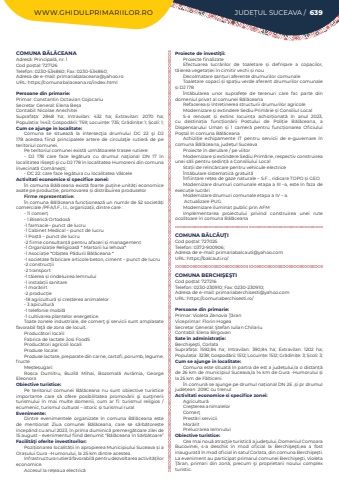 WWW.GHIDULPRIMARIILOR.RO JUDE%u021aUL SUCEAVA / 639COMUNA B%u0102L%u0102CEANAAdres%u0103: Principal%u0103, nr. 1Cod po%u0219tal: 727126Telefon: 0230-534860; Fax: 0230-534860; Adresa de e-mail: primariabalaceana@yahoo.roURL: https://comunabalaceana.ro/index.htmlPersoane din primarie:Primar: Constantin Octavian CojocariuSecretar General: Elena Be%u0219aContabil: Nicolae AnechiteiSuprafa%u021ba:%u00a0 2848 ha; Intravilan:%u00a0 432 ha; Extravilan:%u00a0 2070 ha; Popula%u021bia:%u00a01443; Gospod%u0103rii:%u00a0759; Locuin%u021be:%u00a0735; Gr%u0103dini%u021be:%u00a01; %u0218coli:%u00a01; Cum se ajunge in localitate:Comuna se situeaz%u0103 la intersec%u0163ia drumului DC 22 %u015fi DJ 178 acestea fiind principalele artere de circula%u0163ie rutier%u0103 de pe teritoriul comunei.Pe teritoriul comunei exist%u0103 urm%u0103toarele trasee rutiere:-%u00a0 DJ 178 care face leg%u0103tura cu drumul na%u0163ional DN 17 %u00een localitatea Ili%u0219e%u015fti %u015fi cu DJ 178 %u00een localitatea Humoreni din comuna %u00eenvecinat%u0103 Com%u0103ne%u015fti;-%u00a0DC 22: care face leg%u0103tura cu localitatea V%u00e2lceleActivitati economice si specifice zonei:%u00cen comuna B%u0103l%u0103ceana exist%u0103 foarte pu%u021bine unit%u0103%u021bi economice axate pe produc%u021bie, promovarea %u0219i distribuirea produselorFirme reprezentative:%u00cen comuna B%u0103l%u0103ceana func%u021bioneaz%u0103 un num%u0103r de 52 societ%u0103%u021bi comerciale /PFA/I.F., I.I., organiza%u021bii, dintre care :- 11 comer%u021b- 1 Biseric%u0103 Ortodox%u0103-1 farmacie%u2013 punct de lucru-1 Cabinet Medical %u2013 punct de lucru-1 Po%u0219t%u0103 %u2013 punct de lucru-2 firme consultan%u021b%u0103 pentru afaceri %u0219i management-1 Organiza%u021bie Religioas%u0103 * Martorii lui Iehova*-1 Asocia%u021bie *Ob%u0219tea P%u0103durii B%u0103l%u0103ceana *-1 societate fabricare articole beton, ciment %u2013 punct de lucru-2 construc%u021bii-2 transport-1 t%u0103ierea %u0219i rindeluirea lemnului-1 instala%u021bii sanitare-1 mor%u0103rirt -2 produc%u021bie-18 agricultur%u0103 %u0219i cre%u0219terea animalelor- 3 apicultur%u0103-1 telefonie mobil%u0103-1 cultivarea plantelor energetice.Toate zonele industriale, de comer%u0163 %u015fi servicii sunt amplasate favorabil fa%u0163%u0103 de zona de locuit.Produc%u0103tori locali:Fabrica de lactate Josi FoodSProduc%u0103tori agricoli localiProduse locale:Produse lactate, preparate din carne, cartofi, porumb, legume, fructe Me%u0219te%u0219ugari:Ro%u0219ca Dumitru, Buzil%u0103 Mihai, Bozomal%u0103 Avr%u0103mia, George EleonoraObiective turistice:Pe teritoriul comunei B%u0103l%u0103ceana nu sunt obiective turistice importante care s%u0103 ofere posibilitatea promov%u0103rii %u015fi sus%u0163inerii turismului %u00een mai multe domenii, cum ar fi: turismul religios / ecumenic, turismul cultural %u2013 istoric %u0219i turismul ruralEvenimente:Dintre evenimentele organizate %u00een comuna B%u0103l%u0103ceana este de men%u021bionat Ziua comunei B%u0103l%u0103ceana, care se s%u0103rb%u0103tore%u0219te %u00eencep%u00e2nd cu anul 2023, %u00een prima duminic%u0103 premerg%u0103toare zilei de 15 august %u2013 evenimentul fiind denumit %u201cB%u0103l%u0103ceana %u00een S%u0103rb%u0103toare%u201dFacilit%u00e3%u0163i oferite investitorilor:Pozi%u021bionarea localit%u0103%u021bii %u00een apropierea Municipiului Suceava %u0219i a Ora%u0219ului Gura %u2013Humorului, la 25 km dintre acestea.Infrastructura rutier%u0103 favorabil%u0103 pentru dezvoltarea activit%u0103%u021bilor economice.Accesul la re%u021beaua electric%u0103Proiecte de investi%u0163ii:Proiecte finalizateEfectuarea lucr%u0103rilor de toaletare %u0219i defri%u0219are a copacilor, t%u0103ierea vegeta%u021biei %u00een cimitir vechi %u0219i nouDecolmatare %u0219an%u021buri aferente drumurilor comunaleToaletare copaci %u0219i spa%u021biu verde aferent drumurilor comunale %u0219i DJ 178%u00cent%u0103bularea unor suprafe%u021be de terenuri care fac parte din domeniul privat al comunei B%u0103l%u0103ceanaRefacerea %u0219i %u00eentre%u021binerea structurii drumurilor agricoleModernizare %u0219i extindere Sediu Prim%u0103rie %u0219i Consiliul LocalS-a renovat %u0219i extins locuin%u021ba achizi%u021bionat%u0103 %u00een anul 2023, cu destina%u021bia func%u021bion%u0103rii Postului de Poli%u021bie B%u0103l%u0103ceana, a Dispensarului Uman %u0219i 1 camer%u0103 pentru func%u021bionarea Oficiului Po%u0219tal %u00een comuna B%u0103l%u0103ceanaAchizi%u021bie echipamente IT pentru servicii de e-guvernare %u00een comuna B%u0103l%u0103ceana, jude%u021bul SuceavaProiecte %u00een derulare / pe viitorModernizare %u0219i extindere Sediu Prim%u0103rie, respectiv construirea unei s%u0103li pentru %u0219edin%u021b%u0103 a Consiliului LocalSta%u021bii de re%u00eenc%u0103rcare pentru vehicule electrice%u00cent%u0103bulare sistematic%u0103 gratuit%u0103%u00cenfiin%u021bare re%u021bea de gaze naturale %u2013 S.F. , ridicare TOPO %u0219i GEOModernizare drumuri comunale etapa a III %u2013a, este %u00een faza de execu%u021bie lucr%u0103riModernizare drumuri comunale etapa a IV %u2013 a.%u00a0Actualizare PUG.Modernizare iluminat public prin AFMImplementarea proiectului privind construirea unei rute ocolitoare %u00een comuna B%u0103l%u0103ceanaCOMUNA B%u0102LC%u0102U%u0162ICod po%u0219tal: 727025Telefon: 0372-900906; Adresa de e-mail: primariabalcauti@yahoo.comURL: https://balcauti.ro/COMUNA BERCHI%u015eE%u015eTICod po%u0219tal: 727216Telefon: 0230-230910; Fax: 0230-230910; Adresa de e-mail: primariaberchisesti@yahoo.comURL: https://comunaberchisesti.ro/Persoane din primarie:Primar: Violeta Zenovia %u0162%u0103ranViceprimar:%u00a0Florin HogeaSecretar General: %u015etefan Iulian ChilariuContabil: Elena B%u00eergovanSate %u00een administra%u021bie:Berchi%u015fe%u015fti, CorlataSuprafa%u021ba:%u00a0 1592,84 ha; Intravilan:%u00a0 390,84 ha; Extravilan:%u00a0 1202 ha; Popula%u021bia:%u00a03238; Gospod%u0103rii:%u00a01512; Locuin%u021be:%u00a01512; Gr%u0103dini%u021be:%u00a03; %u