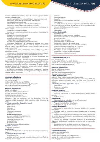 WWW.GHIDULPRIMARIILOR.RO JUDE%u021aUL TELEORMAN / 675realizare sistem de canalizare %u0219i sta%u021bie de epurare a apelor uzate %u00een comuna M%u0103gura PNDLLucr%u0103ri repara%u021bii c%u0103min cultural M%u0103gura %u0219i centrala electric%u0103Reabilitare biseric%u0103%u00a0Sf Ierarh Nicolae, M%u0103gura CNIPietruire drumuri comunaleSistem de supraveghere video %u00een comuna M%u0103guraRepara%u021bii %u0219i%u00a0amenajare curte gr%u0103dini%u021b%u0103%u00a0GuruieniModernizare sediu administrativ pentru servicii medicale %u0219i de interes publicModernizare prim%u0103ria M%u0103gura%u00cemprejmuire sediu administrativ pentru servicii medicale %u0219i de interes public%u00cemprejmuire cimitirul Guruieni%u00cemprejmuire cimitir M%u0103guraAmenajare gard gr%u0103dini%u021b%u0103%u00a0GuruieniPROIECTE DE INVESTI%u021aII VIITOAREEficientizare energie electric%u0103%u00a0iluminat public%u00cenfiin%u021barea capacit%u0103%u021bii de producere energie din surse regenerabile de energie , pentru consum propriu %u00een comuna M%u0103gura, jude%u021bul Teleorman%u2013 fondul pentru modernizare %u00een cadrul programului cheie 1Digitalizarea %u00een folosul cet%u0103%u021benilor comunei M%u0103gura, jude%u021bul Teleorman %u2013 PNRRModernizarea drumurilor de interes local din comuna M%u0103gura, cu fonduri guvernamentale %u0219i europene nerambursabileCre%u0219terea eficien%u021bei energetice la %u0219coala gimnazial%u0103%u00a0 din comuna M%u0103gura, jude%u021bul TeleormanDotarea cu mobilier , materiale didactice %u0219i echipamente digitale a %u0219colii gimnaziale din comuna M%u0103gura, jude%u021bul TeleormanEficientizare energetic%u0103 %u0219i gestionarea inteligent%u0103%u00a0a energiei la gr%u0103dini%u021ba cu program normal nr 2 Guruieni, structura %u0219colar%u0103 arondat%u0103 unit%u0103%u021bii de %u00eenv%u0103%u021b%u0103m%u00e2nt %u0219coala gimnazial%u0103 M%u0103gura, comuna M%u0103gura, jude%u021bul TeleormanEficientizare energetic%u0103 %u0219i gestionarea inteligent%u0103%u00a0a energiei %u00een atelierul %u0219colar %u0219i laborator %u0219coala gimnazial%u0103 M%u0103gura, comuna M%u0103gura, jude%u021bul TeleormanCOMUNA M%u0102LD%u0102ENIAdres%u0103: Principal%u0103, nr. 40Cod po%u0219tal: 147195Telefon: 0247-337112; Fax: 0247-337112; Adresa de e-mail: primariamaldaeni@yahoo.comURL: http://www.primariamaldaeni.ro/Persoane din primarie:Primar: Ion OprinaViceprimar: C%u0103t%u0103lin %u0218tefan MicheanuSecretar: Antonica Tatiana P%u0103uneContabil: Mariana IordacheAdministrator Public: Maria S%u00e2rbuSuprafa%u021ba:%u00a0 7785 ha; Intravilan:%u00a0 391 ha; Extravilan:%u00a0 7330 ha; Popula%u021bia:%u00a0 4025; Gospod%u0103rii:%u00a0 1820; Locuin%u021be:%u00a0 1920; Gr%u0103dini%u021be:%u00a0 2; %u0218coli:%u00a01; Activitati economice si specifice zonei:Administra%u021bie local%u0103%u00cenv%u0103%u021b%u0103m%u00e2ntS%u0103n%u0103tateAgricultur%u0103Cre%u0219terea animalelorComer%u021bFirme reprezentative:UNICOM WOOD PRODUCTION SAPROFI ROM FOOD SRLORANGE ROMANIA S.AO.M.V.PETROMProduse locale:Cererale,produse agroalimentare Obiective turistice:4 biserici ortodoxeEvenimente:Ziua localit%u0103t%u021bi M%u0103ld%u0103eni 21 Mai Sfin%u021bii %u00cemp%u0103ra%u021bi Constantin %u0219i ElenaFacilit%u00e3%u0163i oferite investitorilor:For%u021b%u0103%u00a0de munc%u0103Utilit%u0103%u021bi: alimetare cu ap%u0103%u00a0 ,canalizare,distan%u021b%u0103%u00a0 mic%u0103%u00a0 fa%u021b%u0103%u00a0 de Sta%u021bia C.F. Rosiori NordInternetTelefonie digital%u0103Cablu TVRe%u021bea de drumuri asfaltate %u0219i pietruiteOportunit%u0103%u021biSuprafa%u021b%u0103%u00a0 mare de terenuri agricole,5 km.distan%u021b%u0103%u00a0 fa%u021b%u0103 de municipiul Ro%u0219iorii de Vede , 40 km fa%u021b%u0103 de municipiul AlexandriaAcces la DE 70 Bucure%u0219ti %u2013 Timi%u0219oaraAlimentare cu ap%u0103 CanalizarareProiecte de investi%u0163ii:Sta%u021bie EpurareModernizare Poduri comuna M%u0103ld%u0103eniModernizare Iluminat public %u00een toat%u0103%u00a0localitateaProiecte de viitorExtindere re%u021bea canalizare%u00cenfiin%u021bare Re%u021bea gaze naturaleModernizare drumuri de interes localConstruire %u0219i dotare sediu administrativ Prim%u0103rie%u00cenregistrare sistematic%u0103%u00a0lucr%u0103ri de cadastruAmenajare parc %u00een zona Gr%u0103dini%u021bei nr 2Amenajare parc %u00een zona %u0218coala nr 1Modernizare sistem alimentare cu ap%u0103Refacere plan urbanistic generalCOMUNA M%u00c2RZ%u0102NE%u015eTICod po%u0219tal: 147200Telefon: 0247-331808; Fax: 0247-331808; Adresa de e-mail: primariamarzanesti@yahoo.co.ukURL: https://primarimarzanesti.ro/Persoane din primarie:Primar: Liviu Adrian Mazilu%u00a0Viceprimar:Nelu AlexeSecretar General:Alexandru Bor%u0163un%u00a0Contabil: Marilena Alina %u015etefan%u00a0Sate %u00een administra%u021bie:Cernetu,%u00a0Valea P%u0103rului,%u00a0M%u00e2rz%u0103ne%u015fti,%u00a0TeleormanuSuprafa%u021ba:%u00a0 1300 ha; Intravilan:%u00a0 400 ha; Extravilan:%u00a0 9000 ha; Popula%u021bia:%u00a0 4000; Gospod%u0103rii:%u00a0 2000; Locuin%u021be:%u00a0 2100; Gr%u0103dini%u021be:%u00a0 4; %u0218coli:%u00a05; Activitati economice si specifice zonei:Agricultur%u0103Cre%u015fterea animalelorLegumicultur%u0103Obiective turistice:Cinci biserici ortodoxeFond de v%u00e2n%u0103toare %u015fi bazine hidrografice ideale pentru pescuitP%u0103durea GrosuEvenimente:T%u00e2rg s%u0103pt%u0103m%u00e2nal - s%u00e2mb%u0103t%u0103, %u00een satul TeleormanuFacilit%u00e3%u0163i oferite investitorilor:For%u0163%u0103 de munc%u0103 ieftin%u0103 %u015fi calificat%u0103Distan%u0163%u0103 mic%u0103 fa%u0163%u0103 de AlexandriaProiecte de investi%u0163ii:Eficientizarea sistemului de iluminat public din comuna M%u00e2rz%u0103ne%u0219ti%u00cenfiin%u021bare%u00a0 sta%u021bii de re%u00eenc%u0103rcare vehicule electrice %u00een comuna M%u00e2rz%u0103ne%u0219tiSisteme inteligente de management local pentru dezvoltarea de servicii %u0219i structuri de sprijin ,specializate pentru administra%u021bia pub