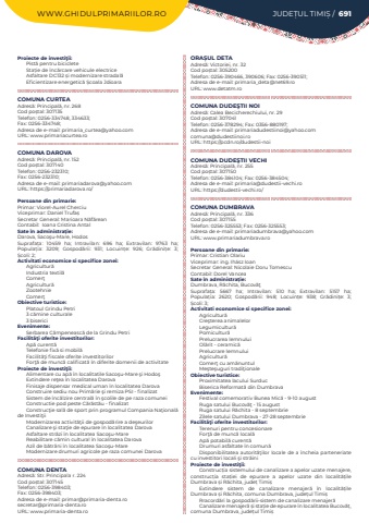 WWW.GHIDULPRIMARIILOR.RO JUDE%u021aUL TIMI%u0218 / 691Proiecte de investi%u0163ii:Pist%u0103%u00a0pentru bicicleteSta%u021bie de %u00eenc%u0103rcare vehicule electriceAsfaltare DC132 %u0219i modernizare stradal%u0103Eficientizare energetic%u0103%u00a0%u0218coala JdioaraCOMUNA CURTEAAdres%u0103: Principal%u0103, nr. 268Cod po%u0219tal: 307135Telefon: 0256-334748, 334633; Fax: 0256-334748; Adresa de e-mail: primaria_curtea@yahoo.comURL: www.primariacurtea.roCOMUNA DAROVAAdres%u0103: Principal%u0103, nr. 152Cod po%u0219tal: 307140Telefon: 0256-232310; Fax: 0256-232310; Adresa de e-mail: primariadarova@yahoo.comURL: https://primariadarova.ro/Persoane din primarie:Primar: Viorel-Aurel CherciuViceprimar: Daniel Trufa%u0219Secretar General: Marioara%u00a0N%u0103f%u0103rean%u00a0Contabil:%u00a0 Ioana Cristina%u00a0AntalSate %u00een administra%u021bie:Darova, Saco%u015fu-Mare, HodosSuprafa%u021ba:%u00a0 10459 ha; Intravilan:%u00a0 696 ha; Extravilan:%u00a0 9763 ha; Popula%u021bia:%u00a0 3209; Gospod%u0103rii:%u00a0 931; Locuin%u021be:%u00a0 926; Gr%u0103dini%u021be:%u00a0 3; %u0218coli:%u00a02; Activitati economice si specifice zonei:Agricultur%u0103Industria textil%u0103Comer%u0163Agricultur%u0103ZootehnieComer%u0163Obiective turistice:Platoul Grindu Petri3 c%u0103mine culturale3 bisericiEvenimente:Serbarea C%u00e2mpeneasc%u0103 de la Grindu PetriFacilit%u00e3%u0163i oferite investitorilor:Ap%u0103 curent%u0103Telefonie fix%u0103 si mobil%u0103Facilit%u0103%u0163i fiscale oferite investitorilorFor%u0163%u0103 de munc%u0103 calificat%u0103 %u00een diferite domenii de activitateProiecte de investi%u0163ii:Alimentare cu ap%u0103 %u00een localitatile Saco%u015fu-Mare %u015fi Hodo%u015fExtindere re%u0163ea %u00een localitatea DarovaFinisaje dispensar medical uman %u00een localitatea DarovaConstruire sediu nou Prim%u0103rie %u015fi remiza PSI - finalizatSistem de %u00eenc%u0103lzire central%u0103 %u00een %u015fcolile de pe raza comuneiConstructie pod peste C%u0103r%u0103st%u0103u - finalizatConstruc%u0163ie sal%u0103 de sport prin programul Compania Na%u0163ional%u0103 de Investi%u0163iiModernizarea activit%u0103%u0163ii de gospod%u0103rire a de%u015feurilorCanalizare %u015fi sta%u0163ie de epurare %u00een localitatea DarovaAsfaltare str%u0103zi %u00een localitatea Saco%u015fu-MareReabilitare c%u0103min cultural %u00een localitatea DarovaAzil de b%u0103tr%u00e2ni %u00een localitatea Saco%u015fu-MareModernizare drumuri agricole pe raza comunei DarovaCOMUNA DENTAAdres%u0103: Str. Principala r. 224Cod po%u0219tal: 307145Telefon: 0256-398403; Fax: 0256-398403; Adresa de e-mail: primar@primaria-denta.rosecretar@primaria-denta.roURL: www.primaria-denta.roORA%u0218UL DETAAdres%u0103: Victoriei, nr. 32Cod po%u0219tal: 305200Telefon: 0256-390466, 390606; Fax: 0256-390511; Adresa de e-mail: primaria_deta@net69.roURL: www.detatm.roCOMUNA DUDE%u015eTII NOIAdres%u0103: Calea Becicherechiului, nr. 29Cod po%u0219tal: 307041Telefon: 0256-378294; Fax: 0356-880197; Adresa de e-mail: primariadudestiinoi@yahoo.comcomuna@dudestiinoi.roURL: https://pcdn.ro/dudestii-noiCOMUNA DUDE%u015eTII VECHIAdres%u0103: Principal%u0103, nr. 255Cod po%u0219tal: 307150Telefon: 0256-384104; Fax: 0256-384504; Adresa de e-mail: primaria@dudestii-vechi.roURL: https://dudestii-vechi.ro/COMUNA DUMBRAVAAdres%u0103: Principal%u0103, nr. 336Cod po%u0219tal: 307155Telefon: 0256-325553; Fax: 0256-325553; Adresa de e-mail: primariadumbrava@yahoo.comURL: www.primariadumbrava.roPersoane din primarie:Primar: Cristian OlariuViceprimar: ing. Ih%u00e1sz IoanSecretar General: Nicolaie Doru TomescuContabil: Dorel VanceaSate %u00een administra%u021bie:Dumbrava, R%u0103chita, Bucov%u0103%u0163Suprafa%u021ba:%u00a0 5667 ha; Intravilan:%u00a0 510 ha; Extravilan:%u00a0 5157 ha; Popula%u021bia:%u00a0 2620; Gospod%u0103rii:%u00a0 948; Locuin%u021be:%u00a0 938; Gr%u0103dini%u021be:%u00a0 3; %u0218coli:%u00a03; Activitati economice si specifice zonei:Agricultur%u0103Cre%u015fterea animalelorLegumicultur%u0103Pomicultur%u0103Prelucrarea lemnuluiOl%u0103rit - ceramic%u0103Prelucrare lemnuluiAgricultur%u0103Comer%u0163 cu am%u0103nuntulMe%u015fte%u015fuguri tradi%u0163ionaleObiective turistice:Proximitatea lacului SurducBiserica Reformat%u0103 din DumbravaEvenimente:Festival comemorativ Bunea Mic%u0103 - 9-10 augustRuga satului Bucov%u0103%u0163 - 15 augustRuga satului R%u0103chita - 8 septembrieZilele satului Dumbrava - 27-28 septembrieFacilit%u00e3%u0163i oferite investitorilor:Terenuri pentru concesionareFor%u0163%u0103 de munc%u0103 local%u0103Ap%u0103 potabil%u0103 curent%u0103Drumuri asfaltate %u00een comun%u0103Disponibilitatea autorit%u0103%u0163ilor locale de a %u00eencheia parteneriate cu investitori locali %u015fi str%u0103iniProiecte de investi%u0163ii:Construc%u021bia sistemului de canalizare a apelor uzate menajere, construc%u021bia sta%u021biei de epurare a apelor uzate din localit%u0103%u021bile Dumbrava %u0219i R%u0103chita, jude%u021b%u00a0Timi%u0219Extindere sistem de canalizare menajer%u0103 %u00een localit%u0103%u021bile Dumbrava %u0219i R%u0103chita, comuna Dumbrava, jude%u021bul Timi%u0219Rracord%u0103ri la gospod%u0103rii-sistem de canalizare menajer%u0103Canalizare menajer%u0103 %u0219i sta%u021bie de epurare %u00een localitatea Bucov%u0103%u021b, comuna Dumbrava, jude%u021bul Timi%u0219