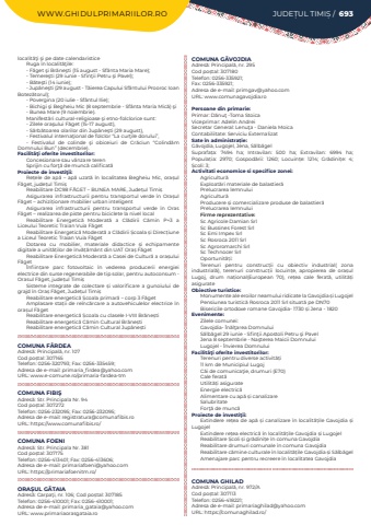 WWW.GHIDULPRIMARIILOR.RO JUDE%u021aUL TIMI%u0218 / 693localit%u0103%u0163i %u015fi pe date calendaristiceRuga %u00een localit%u0103%u0163ile:- F%u0103get %u015fi Br%u0103ne%u015fti (15 august - Sf%u00e2nta%u00a0Maria Mare);- Temere%u015fti (29 iunie - Sfin%u0163ii Petru %u015fi Pavel);- B%u0103te%u015fti (14 iunie); - Jup%u00e2ne%u015fti (29 august - T%u0103ierea Capului Sf%u00e2ntului Prooroc Ioan Botez%u0103torul);- Povergina (20 iulie - Sf%u00e2ntul Ilie);- Bichigi %u015fi Begheiu Mic (8 septembrie - Sf%u00e2nta Maria Mic%u0103) %u015fi- Bunea Mare (9 noiembrie).Manifest%u0103ri cultural-religioase %u015fi etno-folclorice sunt:- Zilele ora%u015fului F%u0103get (15-17 august),- S%u0103rb%u0103toarea olarilor din Jup%u00e2ne%u015fti (29 august),- Festivalul interna%u0163ional de folclor %u201cLa cur%u0163ile dorului%u201d, - Festivalul de colinde %u015fi obiceiuri de Cr%u0103ciun %u201cColind%u0103m Domnului Bun%u201d%u00a0(decembrie).Facilit%u00e3%u0163i oferite investitorilor:Concesionare sau v%u00e2nzare terenSprijin cu for%u0163%u0103 de munc%u0103 calificat%u0103Proiecte de investi%u0163ii:Re%u021bele de ap%u0103 %u2013 ap%u0103 uzat%u0103 %u00een localitatea Begheiu Mic, ora%u0219ul F%u0103get, jude%u021bul Timi%u0219Reabilitare DC98 F%u0102GET %u2013 BUNEA MARE, Jude%u021bul Timi%u0219Asigurarea infrastructurii pentru transportul verde %u00een Ora%u0219ul F%u0103get %u2013 achizi%u021bionare mobilier urban inteligentAsigurarea infrastructurii pentru transportul verde %u00een Oras F%u00e3get %u2013 realizarea de piste pentru biciclete la nivel localReabilitare Energetic%u0103 Moderat%u0103 a Cl%u0103dirii C%u0103min P+3 a Liceului Teoretic Traian Vuia F%u0103getReabilitare Energetic%u0103 Moderat%u0103 a Cl%u0103dirii %u0218coala %u0219i Direc%u021biune a Liceul Teoretic Traian Vuia F%u0103getDotarea cu mobilier, materiale didactice%u00a0 %u0219i echipamente digitale a unit%u0103%u021bilor de %u00eenv%u0103%u021b%u0103m%u00e2nt din UAT Ora%u0219 F%u0103getReabilitare Energetic%u0103 Moderat%u0103 a Casei de Cultur%u0103 a ora%u0219ului F%u0103get%u00cenfiin%u021bare parc fotovoltaic %u00een vederea producerii energiei electrice din surse regenerabile de tip solar, pentru autoconsum - Orasul F%u0103get, jude%u021bul Timi%u0219Sisteme integrate de colectare %u0219i valorificare a gunoiului de grajd %u00een Ora%u0219 F%u0103get, Jude%u021bul Timi%u0219Reabilitare energetic%u0103 %u0218coala primar%u0103 %u2013 corp 3 F%u0103getAmplasare sta%u021bii de re%u00eenc%u0103rcare a autovehiculelor electrice %u00een ora%u0219ul F%u0103getReabilitare energetic%u0103 %u0218coala cu clasele I-VIII Br%u0103ne%u0219tiReabilitare energetic%u0103 C%u0103min Cultural Br%u0103ne%u0219tiReabilitare energetic%u0103 C%u0103min Cultural Jup%u00e2ne%u0219tiCOMUNA F%u00c2RDEAAdres%u0103: Principal%u0103, nr. 107Cod po%u0219tal: 307165Telefon: 0256-320793; Fax: 0256-335459; Adresa de e-mail: primaria_firdea@yahoo.comURL: www.e-comune.ro/primaria-fardea-tmCOMUNA FIBI%u015eAdres%u0103: Str. Principala Nr. 94Cod po%u0219tal: 307272Telefon: 0256-232095; Fax: 0256-232095; Adresa de e-mail: registratura@comunafibis.roURL: https://www.comunafibis.ro/COMUNA FOENIAdres%u0103: Str. Principala Nr. 381Cod po%u0219tal: 307175Telefon: 0256-413401; Fax: 0256-413606; Adresa de e-mail: primariafoeni@yahoo.comURL: https://primariafoenitm.ro/ORA%u0218UL G%u0102TAIAAdres%u0103: Carpa%u0163i, nr. 106; Cod po%u0219tal: 307185Telefon: 0256-410001; Fax: 0256-410001; Adresa de e-mail: primaria_gataia@yahoo.comURL: www.primariaorasgataia.roCOMUNA G%u0102VOJDIAAdres%u0103: Principal%u0103, nr. 295Cod po%u0219tal: 307180Telefon: 0256-335921; Fax: 0256-335921; Adresa de e-mail: primgav@yahoo.comURL: www.comunagavojdia.roPersoane din primarie:Primar: D%u0103nu%u0163 -Toma%u00a0Stoica%u00a0Viceprimar: Adelin Andrei%u00a0Secretar General: Lenu%u0163a - Daniela%u00a0Moica%u00a0Contabiliitate: Serviciu ExternalizatSate %u00een administra%u021bie:G%u0103vojdia, Lugojel, Jena, S%u0103lb%u0103gelSuprafa%u021ba:%u00a0 7494 ha; Intravilan:%u00a0 500 ha; Extravilan:%u00a0 6994 ha; Popula%u021bia:%u00a0 2970; Gospod%u0103rii:%u00a0 1260; Locuin%u021be:%u00a0 1214; Gr%u0103dini%u021be:%u00a0 4; %u0218coli:%u00a03; Activitati economice si specifice zonei:Agricultur%u0103Exploat%u0103ri materiale de balastier%u0103Prelucrarea lemnuluiAgricultur%u0103Producere %u0219i comercializare produse de balastier%u0103Prelucrarea lemnuluiFirme reprezentative:Sc Agricole Damian SrlSc Bussines Forest SrlSc Emi Impex SrlSc Rosroca 2011 SrlSc Agroromarchi SrlSc Technocer SrlOportunit%u0103%u021bi:Terenuri pentru construc%u021bii cu obiectiv industrial( zona industrial%u0103), terenuri construc%u021bii locuin%u021be, apropierea de ora%u0219ul Lugoj, drum na%u021bional(European 70), re%u021bea cale ferat%u0103, utilit%u0103%u021bi asigurateObiective turistice:Monumente%u00a0ale eroilor neamului ridicate la Gavojdia %u0219i LugojelPensiunea turistic%u0103 Rosroca 2011 Srl situat%u0103 pe DN70Bisericile ortodoxe romane Gavojdia- 1730 %u0219i Jena - 1820Evenimente:Zilele comunei:Gavojdia- %u00cen%u0103l%u0163area DomnuluiS%u0103lb%u0103gel 29 iunie - Sfin%u0163ii%u00a0Apostoli Petru %u015fi PavelJena 8 septembrie - Na%u015fterea Maicii DomnuluiLugojel - %u00cenvierea DomnuluiFacilit%u00e3%u0163i oferite investitorilor:Terenuri pentru diverse activit%u0103%u021bi11 km de Municipiul LugojC%u0103i de comunica%u0163ie, drumuri (E70)Cale ferat%u0103Utilit%u0103%u021bi asigurateEnergie electric%u0103Alimentare cu ap%u0103 %u0219i canalizareSalubritateFor%u0163%u0103 de munc%u0103Proiecte de investi%u0163ii:Extindere re%u021bea de ap%u0103 %u0219i canalizare %u00een localit%u0103%u021bile Gavojdia %u0219i LugojelExtindere re%u021bea electric%u0103 %u00een%u00a0localit%u0103%u021bile Gavojdia %u0219i LugojelReabilitare %u0218coli %u0219i gr%u0103dini%u021be %u00een comuna GavojdiaReabilitare drumuri comunale %u00een comuna GavojdiaReabilitare c%u0103mine culturale %u00een local