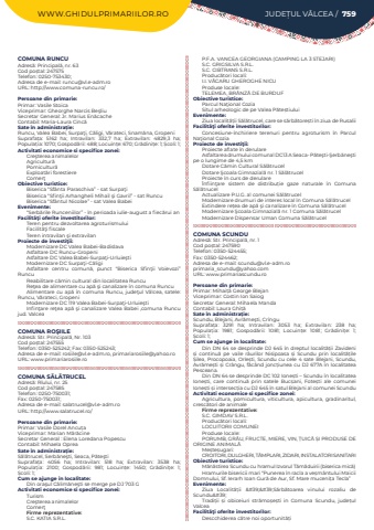 WWW.GHIDULPRIMARIILOR.RO JUDE%u021aUL V%u00c2LCEA / 759COMUNA RUNCUAdres%u0103: Principal%u0103, nr. 63Cod po%u0219tal: 247575Telefon: 0250-753430; Adresa de e-mail: runcu@vl.e-adm.roURL: http://www.comuna-runcu.ro/Persoane din primarie:Primar: Vasile StoicaViceprimar: Gheorghe Narcis Be%u015fliuSecretar General: Jr. Marius En%u0103cacheContabil: Maria-Laura Cinc%u0103Sate %u00een administra%u021bie:Runcu, Valea Babei, Surpa%u0163i, C%u0103ligi, V%u0103rateci, Snam%u0103na, GropeniSuprafa%u021ba:%u00a0 5162 ha; Intravilan:%u00a0 332,7 ha; Extravilan:%u00a0 4829,3 ha; Popula%u021bia:%u00a01070; Gospod%u0103rii:%u00a0488; Locuin%u021be:%u00a0670; Gr%u0103dini%u021be:%u00a01; %u0218coli:%u00a01; Activitati economice si specifice zonei:Cre%u015fterea animalelorAgricultur%u0103Pomicultur%u0103Exploat%u0103ri forestiereComer%u0163 Obiective turistice:Biserica %u201cSf%u00e2nta Paraschiva%u201d - sat Surpa%u0163iBiserica %u201cSfin%u0163ii Arhangheli Mihail %u015fi Gavril%u201d - sat RuncuBiserica %u201cSf%u00e2ntul Nicolae%u201d - sat Valea BabeiEvenimente:%u201cSerb%u0103rile Runceniilor%u201d - %u00een perioada iulie-august a fiec%u0103rui anFacilit%u00e3%u0163i oferite investitorilor:Teren pentru dezvoltarea agroturismuluiFacilit%u0103%u0163i fiscaleTeren intravilan %u015fi extravilanProiecte de investi%u0163ii:Modernizare DC Valea Babei-BadislavaAsfaltare DC Runcu-GropeniAsfaltare DC Valea Babei-Surpa%u0163i-Urluie%u015ftiModernizare DC Surpa%u0163i-C%u0103ligiAsfaltare centru comun%u0103, punct %u201cBiserica Sfin%u0163ii Voievozi%u201d RuncuReabilitare c%u0103min cultural din localitatea RuncuRe%u0163ea de alimentare cu ap%u0103 %u015fi canalizare %u00een comuna RuncuAlimentare cu ap%u0103 %u00een comuna Runcu, jude%u0163ul V%u00e2lcea, satele: Runcu, V%u0103rateci, Gropeni%u00a0Modernizare DC 119 Valea Babei-Surpa%u0163i-Urluie%u015ftiInfin%u0163are re%u0163ea ap%u0103%u00a0%u015fi%u00a0canalizare Valea Babei ,comuna Runcu jud. ValceaCOMUNA RO%u015eIILEAdres%u0103: Str. Principal%u0103, Nr. 103Cod po%u0219tal: 247555Telefon: 0350-525242; Fax: 0350-525243; Adresa de e-mail: rosiile@vl.e-adm.ro, primariarosiile@yahoo.roURL: www.primariarosiile.roCOMUNA S%u0102L%u0102TRUCELAdres%u0103: R%u00eeului, nr. 25Cod po%u0219tal: 247585Telefon: 0250-750031; Fax: 0250-750031; Adresa de e-mail: salatrucel@vl.e-adm.roURL: http://www.salatrucel.ro/Persoane din primarie:Primar: Vasile Dorel Ancu%u021baViceprimar: Marian M%u0103r%u0103cineSecretar General : Elena Loredana PopescuContabil: Mihaela OpreaSate %u00een administra%u021bie:S%u0103l%u0103trucel, Serb%u0103ne%u015fti, Seaca, P%u0103te%u015ftiSuprafa%u021ba:%u00a0 4056 ha; Intravilan:%u00a0 518 ha; Extravilan:%u00a0 3538 ha; Popula%u021bia:%u00a0 2100; Gospod%u0103rii:%u00a0 981; Locuin%u021be:%u00a0 1450; Gr%u0103dini%u021be:%u00a0 1; %u0218coli:%u00a01; Cum se ajunge in localitate:Din ora%u015ful C%u0103lim%u0103ne%u015fti se merge pe DJ 703 GActivitati economice si specifice zonei:TurismCre%u015fterea animalelorComer%u0163Firme reprezentative:S.C. KATIA S.R.L.P.F.A. VANCEA GEORGIANA (CAMPING LA 3 STEJARI)S.C. GRIGSILVA S.R.L.S.C. CIBTRANS S.R.L.Produc%u0103tori locali:I.I. V%u0102CARU GHEROGHE NICUProduse locale: TELEMEA, BR%u00c2NZ%u0102 DE BURDUFObiective turistice:Parcul Na%u0163ional Cozia Situl arheologic de pe Valea P%u0103te%u0219tiuluiEvenimente:Ziua localit%u0103%u021bii S%u0103l%u0103trucel, care se s%u0103rb%u0103tore%u0219ti %u00een ziua de RusaliiFacilit%u00e3%u0163i oferite investitorilor:Concesiune-%u00eenchiriere terenuri pentru agroturism %u00een Parcul Na%u0163ional CoziaProiecte de investi%u0163ii:Proiecte aflate %u00een derulareAsfaltarea drumului comunal DC13 A Seaca- P%u0103te%u015fti-%u015eerb%u0103ne%u015fti pe o lungime de 4,5 kmDotare C%u0103min Cultural S%u0103l%u0103trucelDotare %u015ecoala Gimnazial%u0103 nr. 1 S%u0103l%u0103trucelProiecte %u00een curs de derulare%u00cenfiin%u0163are sistem de distribu%u021bie gaze naturale %u00een Comuna S%u0103l%u0103trucelActualizare P.U.G. al comunei S%u0103l%u0103trucelModernizare drumuri de interes local %u00een Comuna S%u0103l%u0103trucelExtindere re%u021bea de ap%u0103 %u015fi canalizare %u00een Comuna S%u0103l%u0103trucelModernizare %u015ecoala Gimnazial%u0103 nr. 1 Comuna S%u0103l%u0103trucelModernizare Dispensar Uman Comuna S%u0103l%u0103trucelCOMUNA SCUNDUAdres%u0103: Str. Principal%u0103, nr. 1Cod po%u0219tal: 247590Telefon: 0350-524455; Fax: 0350-524462; Adresa de e-mail: scundu@vl.e-adm.roprimaria_scundu@yahoo.comURL: www.primariascundu.roPersoane din primarie:Primar:%u00a0Mihai%u021b%u0103%u00a0George Blejan%u00a0Viceprimar: Costin Ion Saiog%u00a0Secretar General: Mihaela MandaContabil: Laura Ghi%u021b%u0103%u00a0Sate %u00een administra%u021bie:Scundu, Blejani, Avr%u0103me%u015fti, Cr%u00eenguSuprafa%u021ba:%u00a0 3291 ha; Intravilan:%u00a0 3053 ha; Extravilan:%u00a0 238 ha; Popula%u021bia:%u00a0 1981; Gospod%u0103rii:%u00a0 1081; Locuin%u021be:%u00a0 1081; Gr%u0103dini%u021be:%u00a0 1; %u0218coli:%u00a01; Cum se ajunge in localitate:Din DN 64 se desprinde DJ 645 %u00een dreptul localit%u0103%u021bii Zavideni %u0219i continu%u0103%u00a0 pe vaile r%u00e2urilor Nisipoasa %u0219i Scundu prin localit%u0103%u021bile %u0218ilea, Procopoaia, Orle%u0219ti, Scundu cu cele 4 sate Blejani, Scundu, Avr%u0103me%u0219ti %u0219i Cr%u00e2ngu, f%u0103c%u00e2nd jonc%u021biunea cu DJ 677A %u00een localitatea Pesceana.Din DN 64 se desprinde DC 102 Ione%u0219ti %u2013 Scundu %u00een localitatea Ione%u0219ti, care continu%u0103%u00a0 prin satele Buc%u0219ani, Fote%u0219ti ale comunei Ione%u0219ti %u0219i intersec%u021bia cu DJ 645 %u00een satul Blejani al comunei ScunduActivitati economice si specifice zonei:Agricultura, pomicultura, viticultura, apicultura, gradinaritul, cresc%u0103tori de animaleFirme reprezentative:S.C. GIMDAV S.R.L.Produc%u0103tori locali:LOCUITORII COMUNEIProduse locale:PORUMB, GR%u00c2U, FRUCTE, MIERE, VIN, %u021aUIC%u0102%u00a0%u0218I PRODUSE DE ORIGINE ANIMAL%u010