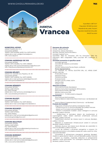 WWW.GHIDULPRIMARIILOR.RO 765Suprafa%u021b%u0103: 4.857 km%u00b2Popula%u021bie: 391.263 locuitoriRe%u0219edin%u021b%u0103 de jude%u021b: Foc%u0219aniPopula%u021bia re%u0219edin%u021bei de jude%u021b: 99.527 locuitoriJUDE%u021aULVranceaMUNICIPIUL ADJUDAdres%u0103: Stadionului, nr. 2Cod po%u0219tal: 625800Telefon: 0237-641908, 641911; Fax: 0237-641912; Adresa de e-mail: uat@primariaadjud.roURL: www.adjud.roCOMUNA ANDREIA%u015eU DE JOSCod po%u0219tal: 627005Telefon: 0374-054984; Fax: 0374-096567; Adresa de e-mail: primariaandreiasuvn@yahoo.comURL: http://www.andreiasu.primarievn.roCOMUNA B%u0102LE%u015eTIAdres%u0103: Str. General Gicu Popescu, Nr. 33Cod po%u0219tal: 627015Telefon: 0237-249036; Fax: 0237-249036; Adresa de e-mail: primaria_balesti@yahoo.comURL: www.primariabalesti.roCOMUNA B%u00c2RSE%u015eTICod po%u0219tal: 627020Telefon: 0237-273410; Fax: 0237-273428; Adresa de e-mail: primaria_birsesti@yahoo.roURL: www.birsesti.primarievn.roCOMUNA BILIE%u015eTICod po%u0219tal: 627331Telefon: 0237-262544; Fax: 0237-262544; Adresa de e-mail: contact@primariabiliesti.roCOMUNA BOGHE%u015eTICod po%u0219tal: 627025Telefon: 0237-273054; Fax: 0237-273054; Adresa de e-mail: primariaboghesti@yahoo.comsecretarboghesti@yahoo.comCOMUNA BOLOTE%u015eTICod po%u0219tal: 537000Telefon: 0237-678111; Fax: 0237-678004; Adresa de e-mail: primar@bolotesti.primarievn.ro URL: bolotesti.primarievn.ro COMUNA BORDE%u015eTICod po%u0219tal: 627045Telefon: 0237-254100; Fax: 0237-254100; Adresa de e-mail: primariabordesti@yahoo.comURL: www.comunabordesti.roPersoane din primarie:Primar:%u00a0 Adrian%u00a0Gavril%u0103Viceprimar: Adrian MarinescuSecretar General: Dorina%u00a0NicolescuContabil: Gabriel%u00a0Turcu%u00a0Suprafa%u021ba:%u00a0 1663 ha; Intravilan:%u00a0 270 ha; Extravilan:%u00a0 1394 ha; Popula%u021bia:%u00a0 1657; Gospod%u0103rii:%u00a0 1035; Locuin%u021be:%u00a0 817; Gr%u0103dini%u021be:%u00a0 2; %u0218coli:%u00a02; Activitati economice si specifice zonei:Activit%u0103%u021bi agricoleActivit%u0103%u021bi de cre%u0219tere a animalelor Viticultura Comer%u021b, prelucrarea fierului forjat, confec%u021bieFirme reprezentative:S.C. MADVIR, S.C. METAL ELECTRO SRL, S.C. KRISS CONF WORK LINE SRLProduc%u0103tori locali:Persoane fizicePersoane juridiceProduse locale:Struguri, prune, cire%u0219e, vi%u0219ineOportunit%u0103%u0163i Turism ruralObiective turistice:Monumentul eroilor Borde%u0219teniBiserica monument Constantin Br%u00eencoveanu Monumentul eroilor 1916-1918%u00a0B%u0103t%u0103lia Cr%u0103ciunului 1916Simpozion C - Tin Br%u00eencoveanu (august)Evenimente:Ziua Comunei 26 OctombrieHramul Bisericii Adormirea Maicii Domnului- sat Borde%u0219tii de JosHramul Bisericii Na%u0219terea Maicii Domnului %u2013 sat Borde%u0219tiProiecte de investi%u0163ii:Asigurarea infrastructurii pentru transportul verde-%u00a0Infrastructura tic %u00een comuna Borde%u0219ti din jude%u021bul Vrancea- Sistem wi-fi la nivelul comunei Borde%u0219ti- Dotare %u0219i amplasare mobilier urban inteligent %u00een comuna Borde%u0219ti, jude%u021bul Vrancea- Modernizare %u0219i extindere sistem de monitorizare %u0219i%u00a0 supraveghere video, sistem alarmare antiefrac%u021bie comuna Borde%u0219ti, jude%u00e2ul%u00a0VranceaModernizare drumuri de interes local %u00een comuna Borde%u0219ti, jude%u021bul%u00a0 VranceaRefacere %u0219i modernizare infrastructur%u0103%u00a0 rutier%u0103%u00a0 %u00een comuna%u00a0 Borde%u0219ti, jude%u021bul%u00a0VranceaRefacere drumuri de interes local afectate de calamit%u0103%u021bi %u00een%u00a0 Comuna Borde%u0219ti, jude%u021bul VranceaLucr%u0103ri de cre%u0219tere a eficien%u021bei energetice a corpului C4%u00a0 (centrala termic%u0103) %u0219i a C6 (cl%u0103dire %u0219coala) din cadru %u0219colii inv. Ghe.Asanache Borde%u0219tiConsolidare %u0219i eficientizare energetic%u0103 gr%u0103dini%u021ba Borde%u0219ti,%u00a0 Cladire cu grad seismic ridicat, comuna Borde%u0219ti, jude%u021bul VranceaDotare cu mobilier, materiale didactice %u0219i echipamente digitale a %u0219colii gimnaziale %u201c%u00eenv. Gheorghe Asanache %u201ccomuna Borde%u0219ti, jude%u021bul Vrancea%u00a0