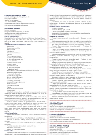 WWW.GHIDULPRIMARIILOR.RO JUDE%u021aUL BAC%u0102U / 87COMUNA %u015eTEFAN CEL MAREAdres%u0103: Sat Negoie%u015fti, Principal%u0103, nr. 20Cod po%u0219tal: 607605Telefon: 0234-339000; Fax: 0234-339050, 339250; Adresa de e-mail: stefancelmare@bc.e-adm.roURL: www.comunastefancelmare.roPersoane din primarie:Primar: Ion VlasieViceprimar: C%u0103t%u0103lin Botezatu IordacheSecretar General: Adriana GherasimContabil: Ioana Oana StoicaSate %u00een administra%u021bie:Negoie%u015fti, %u015etefan cel Mare, Bogdana, R%u0103deana, Gutina%u015f, Vii%u015foaraSuprafa%u021ba:%u00a0 4423 ha; Intravilan:%u00a0 460 ha; Extravilan:%u00a0 3963 ha; Popula%u021bia:%u00a0 5999; Gospod%u0103rii:%u00a0 2180; Locuin%u021be:%u00a0 2244; Gr%u0103dini%u021be:%u00a0 2; %u0218coli:%u00a03; Activitati economice si specifice zonei:AgriculturaCre%u0219terea animalelorPomicultur%u0103Viticultur%u0103Prelucrarea lemnuluiComer%u021bFirme reprezentative:SC Interagroaliment SRLSC Prodagro Braifner SRLSC New Est SRLI.I. Vlasie Razvan IonelI.I. Stoica SorinS,C, Comactiv SRLSC Agrotim Prod SRLProduc%u0103tori locali:Barbu Marius %u0219i Ropotan Neculai (miere de albine)Botezatu C%u0103t%u0103lin (mure)Petcu Maria (fructe)Gavril%u0103%u00a0Maria (legume)Ghinea Adrian (C%u0103p%u0219uni)Bontas Ioan ClaudiuCiubotaru Ion (ovine)Niculau Gheorghe (porumb)Produse locale:Legume %u0219i zarzavatFructeProduse de carmangerieOportunit%u0103%u021biRela%u021biile %u00een teritoriu %u00eentre localit%u0103%u021bile componente ale comunei %u0218tefan cel Mare se realizeaz%u0103%u00a0 pe drumul na%u021bional DN 11A %u0219i pe drumurile comunale %u0219i jude%u021bene existenteRela%u021biile cu comunele %u00eenvecinate Gura V%u0103ii, Valea Seac%u0103, M%u0103n%u0103stirea Casin, Casin %u0219i Buciumi se realizeaz%u0103%u00a0pe DN 11A %u0219i pe drumurile comunale nr: 121, 124, 125, 113, 112 %u0219i 120Comuna Stefan cel Mare se g%u0103se%u0219te %u00een zona de influen%u021b%u0103%u00a0 a municipiului One%u0219ti, acesta constituind un avantaj din punct de vedere al rela%u021biilor care se pot dezvolta %u00eentre sat %u0219i ora%u0219De asemenea comuna %u0218tefan cel Mare are acces la calea ferat%u0103%u00a0 ceea ce-i ofer%u0103%u00a0 posibilitatea unor rela%u021bii cu localit%u0103%u021bi indepartate %u00een ceea ce prive%u0219te transportul de m%u0103rfuri %u0219i c%u0103l%u0103toriObiective turistice:M%u0103n%u0103stirea Bogdana (1660-1670), ctitoria boierului Solomon B%u00e2rl%u0103deanuBiserica cu hramul %u201cSf%u00e2ntul Mihail%u201d (1628) din satul R%u0103deanaBiserica cu hramul %u201cSfin%u021bii Voievozi%u201d (1817-1818) din satul GutinasBiserica de lemn cu hramul %u201cSf%u00e2ntul Dumitru%u201d (1806) din satul Negoie%u0219tiPodul de piatr%u0103 ce dateaz%u0103%u00a0din secolul XV-leaBiblioteca Ion SusanuStatuia lui Gheorghe%u00a0DoniciEvenimente:Manifest%u0103ri dedicate comemor%u0103rii %u0219i s%u0103rb%u0103toririi evenimentului %u201eZiua Eroilor%u201d, eveniment desf%u0103%u0219urat de c%u0103tre Primaria Comunei %u0218tefan cel Mare %u00eempreuna cu elevii %u0218colii Gimnaziale Nr. 1 Negoie%u0219tiManifest%u0103ri tradi%u021bionale cu ocazia S%u0103rb%u0103torilor de Iarna, respectiv primirea colind%u0103torilor %u00een spiritul acestor tradi%u021bii %u0219i obiceiuriManifest%u0103ri prin care se acord%u0103%u00a0 diplome jubiliare pentru aniversarea a 50 de ani de c%u0103s%u0103torie, diplome ce se acord%u0103 %u00een cadru festivFacilit%u00e3%u0163i oferite investitorilor:Drumuri asfaltateAcces la utilit%u0103%u021bi: ap%u0103, curentCanalizare %u00een satele R%u0103deana %u0219i Vii%u0219oaraAcces la DN 11A cu leg%u0103tura %u00eentre Municipiile One%u0219ti %u0219i AdjudAcces la calea ferat%u0103%u00a0(gar%u0103)Proiecte de investi%u0163ii:Fonduri Guvernamentale Nerambursabile %u2013 Depuse %u00een anul 2024Eficientizarea sistemului de iluminat public %u00een Comuna %u0218tefan cel Mare, sat Vii%u0219oara %u0219i str%u0103zile secundare din R%u0103deana %u0219i Gutina%u0219Pod beton armat peste r%u00e2ul Trotus, comuna %u0218tefan cel MareFonduri Guvernamentale Nerambursabile %u2013 Finalizate %u00een cursul anului 2024Centru Socio-Medical, comuna %u0218tefan cel Mare, jude%u021bul Bac%u0103uModernizare %u0219i eficientizare sistem de iluminat public %u00een Comuna %u0218tefan cel MareEficientizarea sistemului de iluminat public %u00een comuna %u0218tefan cel Mare, localitatile R%u0103deana, Negoie%u0219ti %u0219i Bogdana, jude%u021bul Bac%u0103u (Et. II)Fonduri Guvernamentale Nerambursabile %u2013 Proiecte %u00een curs de implementare %u00een cursul anului 2024Refacere %u0219i reabilitarea drumurilor pentru eliminarea efectelor inunda%u021biilor %u00een Comuna %u0218tefan cel Mare, jude%u021bul Bac%u0103uReabilitarea termic%u0103 %u0219i modernizarea %u0218colii Gimnaziale nr. 1 Negoie%u0219ti, comuna %u0218tefan cel Mare, jude%u021bul Bac%u0103uModernizare drumuri comunale, s%u0103te%u0219ti %u0219i de interes local %u00een satele din Comuna %u0218tefan cel Mare, jude%u021bul Bac%u0103uFonduri Externe Nerambursabile %u2013 Depuse %u00een anul 2024Cre%u0219terea eficien%u021bei energetice la %u0218coala din satul Gutina%u0219, Comuna %u0218tefan cel Mare, jude%u021bul Bac%u0103uConstruire miniteren sport la %u0219coala cu clasele I-VIII din satul Gutinas, Comuna %u0218tefan cel Mare, jude%u021bul Bac%u0103uFonduri Externe Nerambursabile - Proiecte %u00een curs de implementare %u00een anul 2024Construire Centru de zi pentru copii expu%u0219i riscului de a fi separa%u021bi de familie Comuna %u0218tefan cel MareDotarea cu mobilier, materiale didactice %u0219i echipamente digitale a %u0218colii Gimnaziale nr. 1 Negoie%u0219ti din Comuna %u0218tefan Cel Mare, Jude%u021bul Bac%u0103uLoc de joac%u0103%u00a0sat. Vii%u0219oara, comuna %u0218tefan cel MareElaborarea/actualizarea %u00een format GIS a documenta%u021biilor de amenajare a teritoriului %u0219i de planificare urban%u0103Achizi%u021bie sistem de monitorizare video %u00een 
